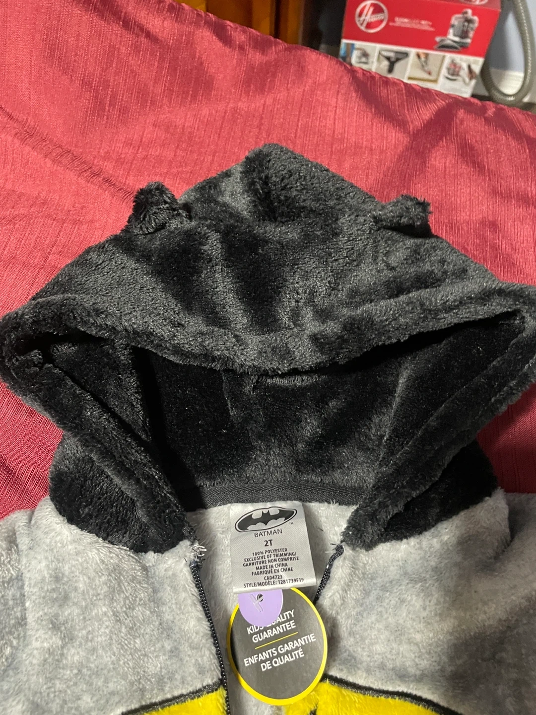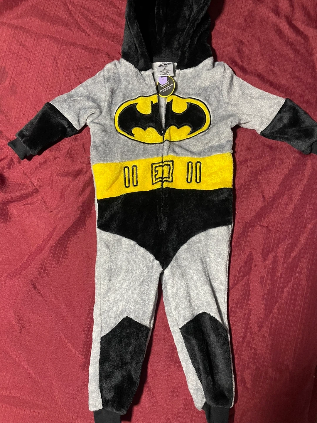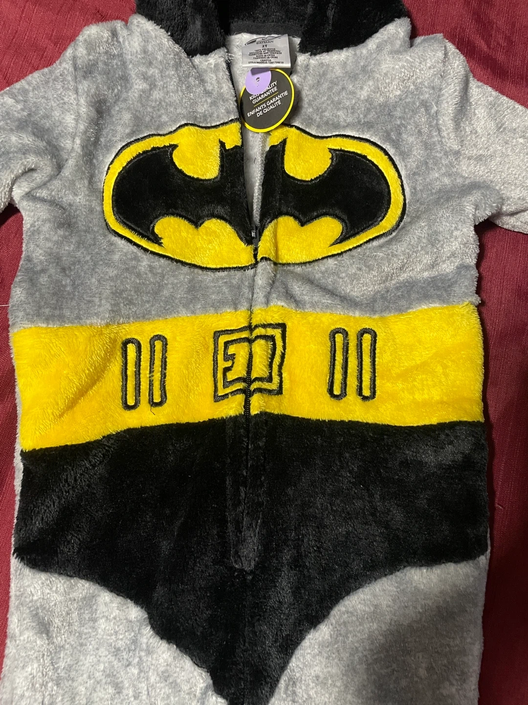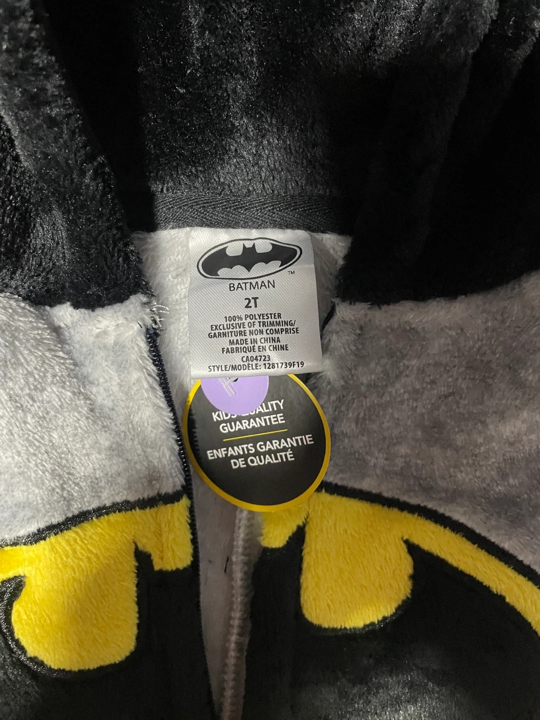 Kids' Batman fleece sleepsuit in size 2T. It's made of 100% polyester for extra warmth. This one-piece pajama is great for little DC Comics fans!