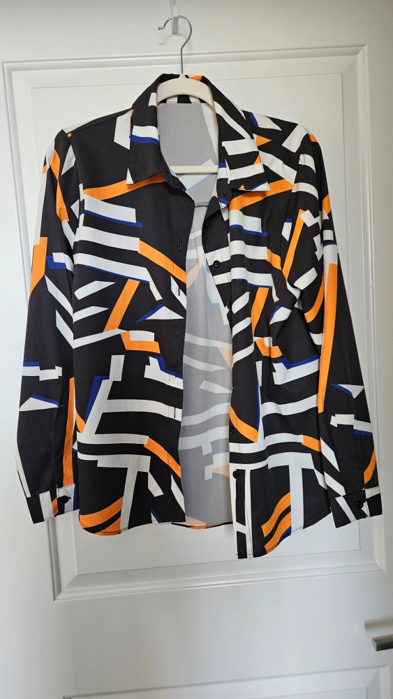 Here's a fun patterned Women's button-up shirt! It's a size large (8-10) and features a cool geometric design with black, white, orange, and blue colours. Perfect for adding a pop of style to your wardrobe this summer.