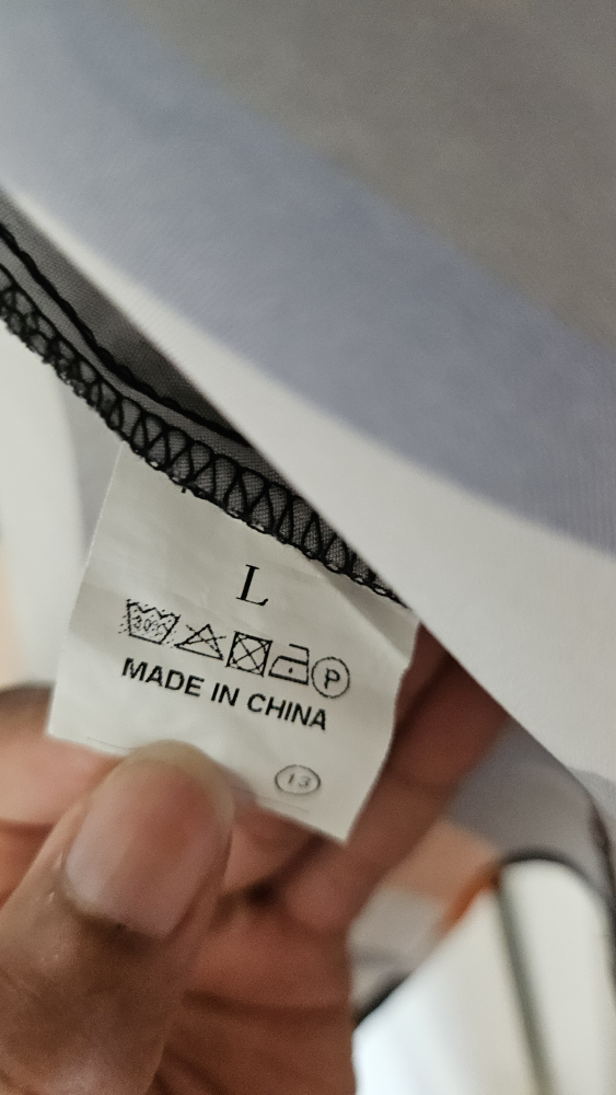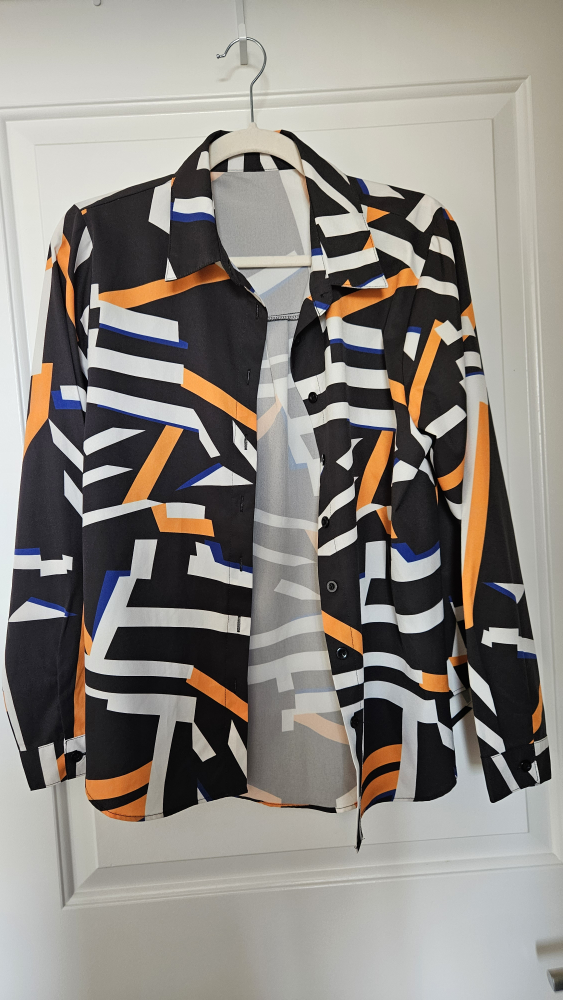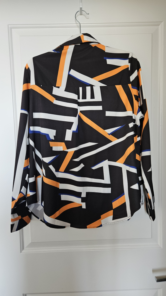 Here's a fun patterned Women's button-up shirt! It's a size large (8-10) and features a cool geometric design with black, white, orange, and blue colours. Perfect for adding a pop of style to your wardrobe this summer.