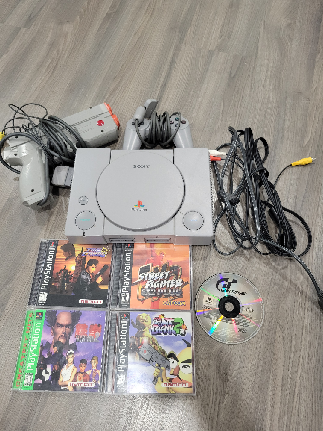 Selling a classic Sony PlayStation console! It comes with two controllers (one light gun), and several games including: