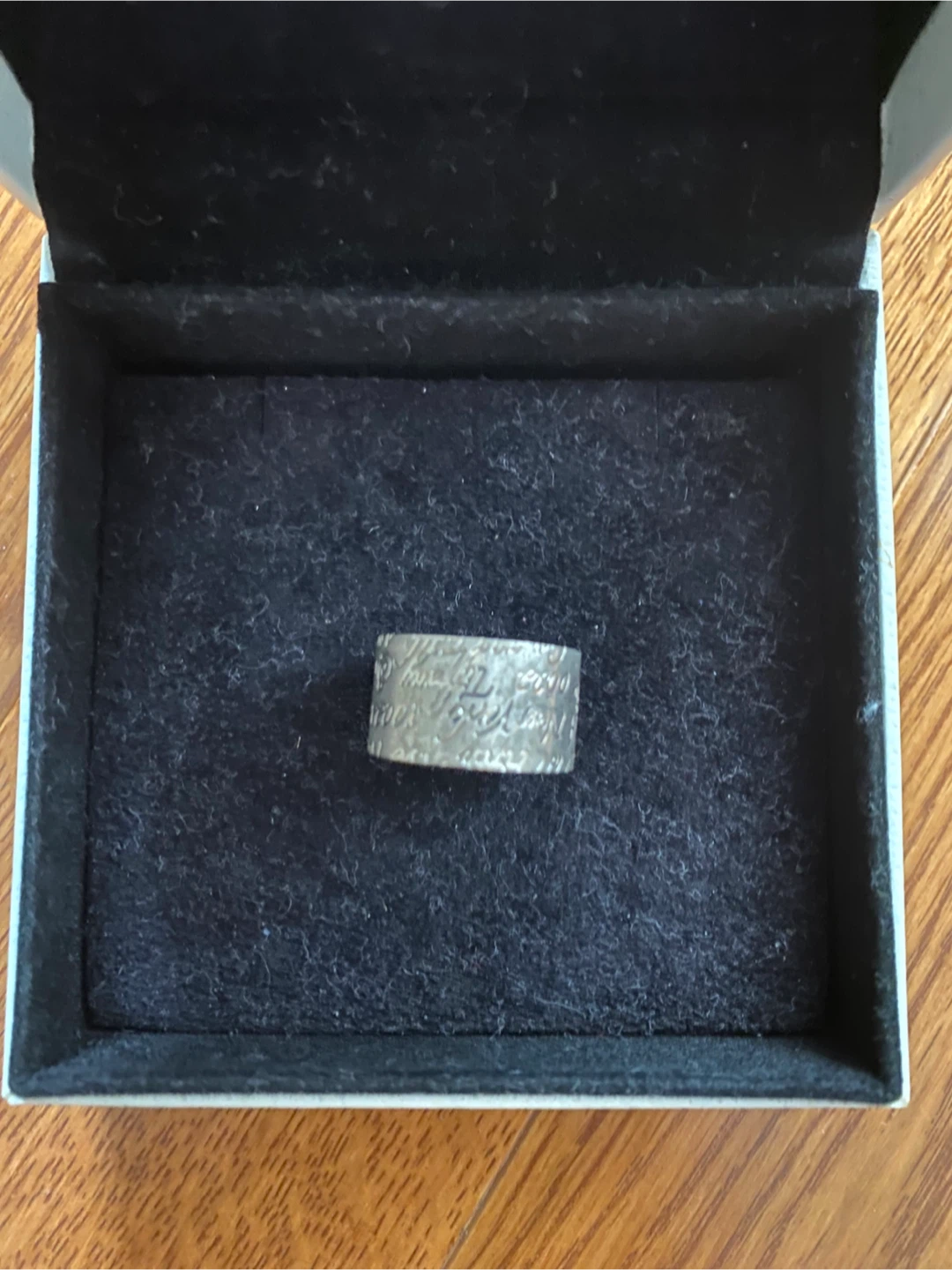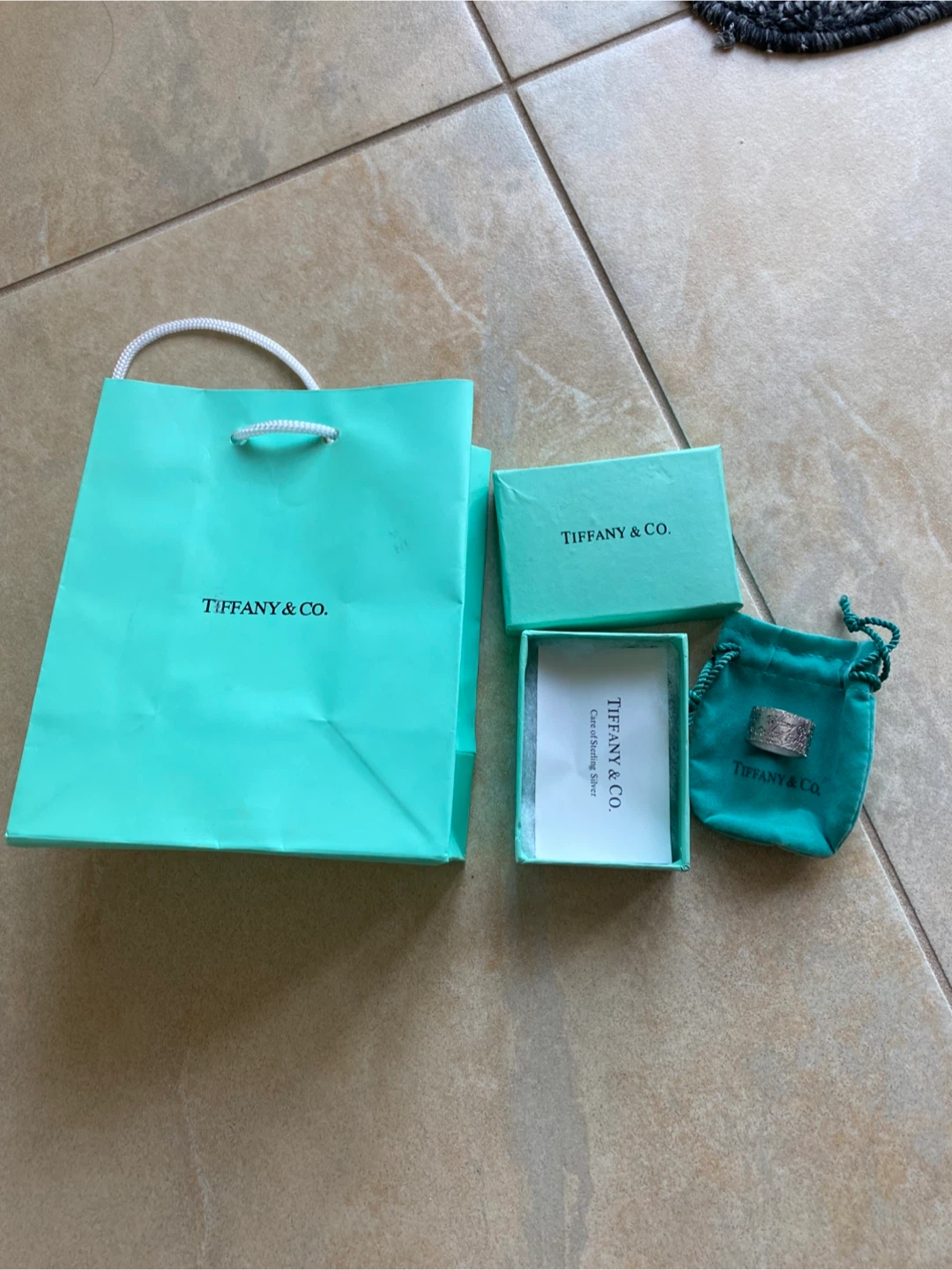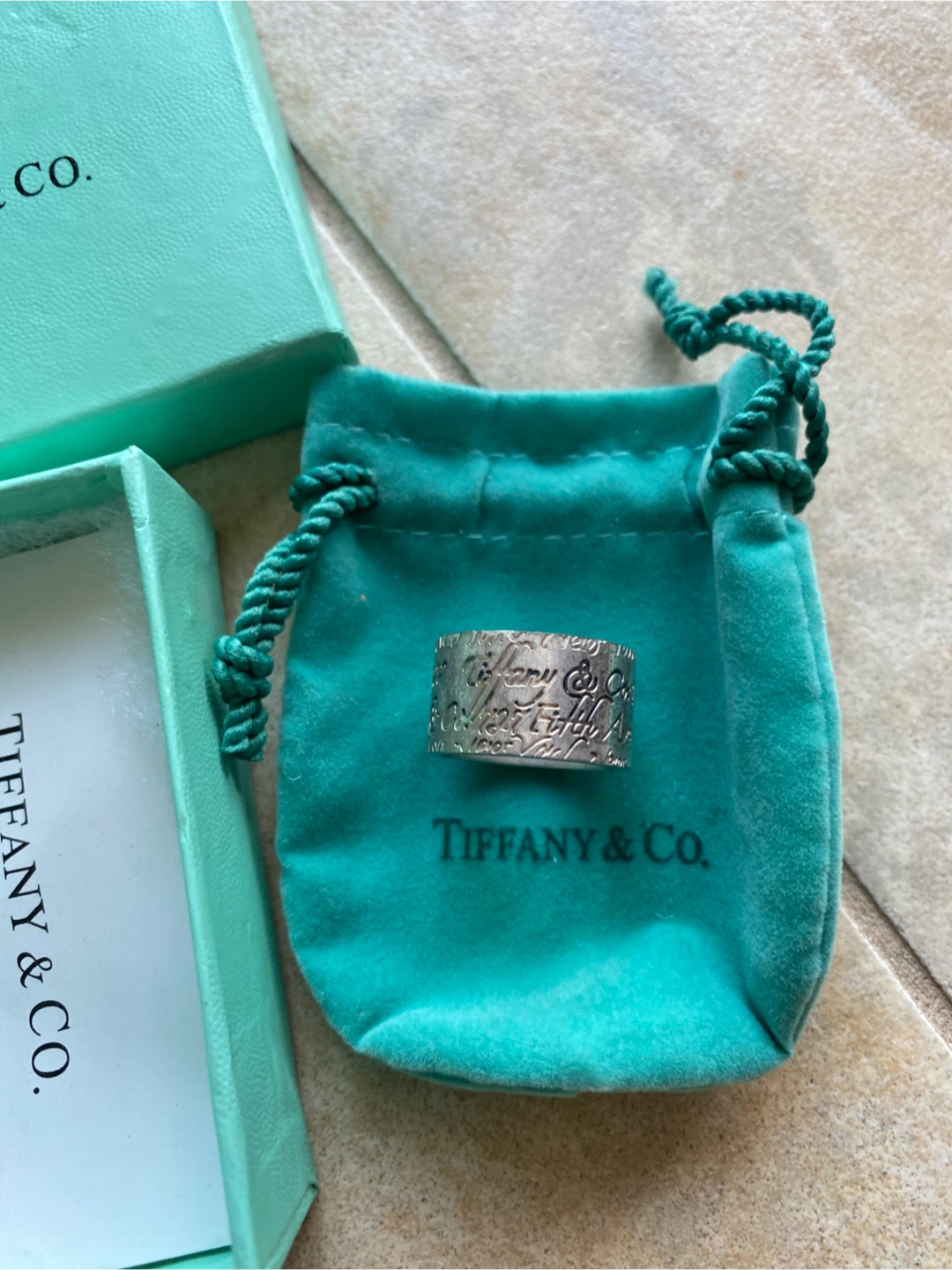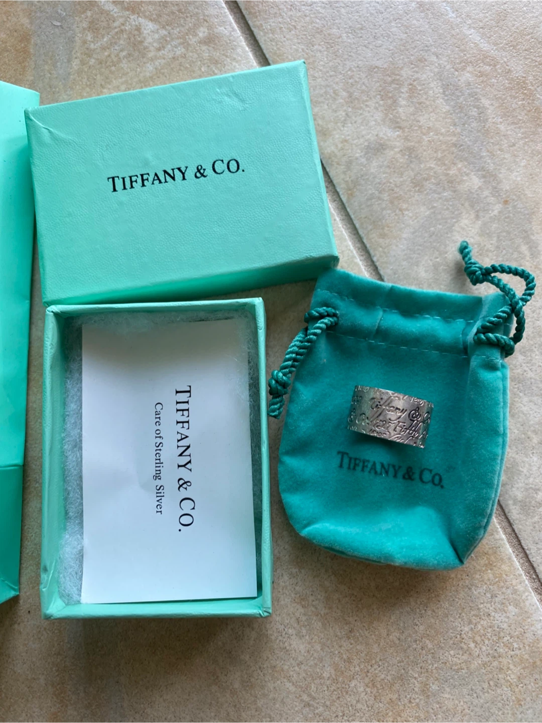 This is a beautiful Tiffany Wide Band ring with engraved text all around. Comes with original box, pouch and gift bag.