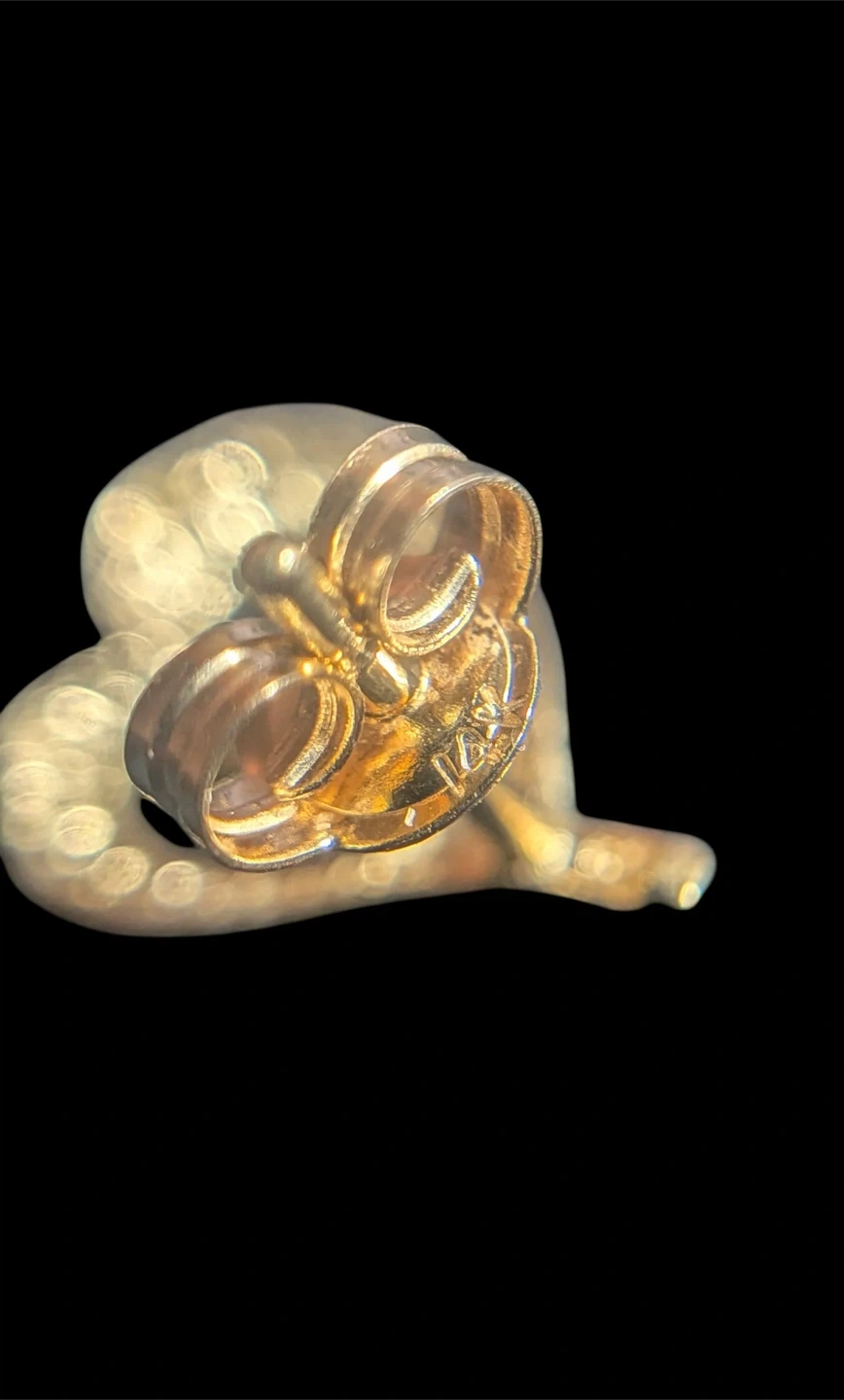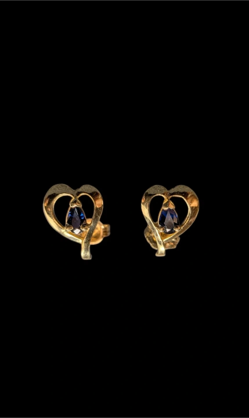 These sweet 10K gold earrings feature a heart design. Each earring has a small, sparkling blue stone at its centre. They're a lovely choice for adding a touch of colour to any outfit.