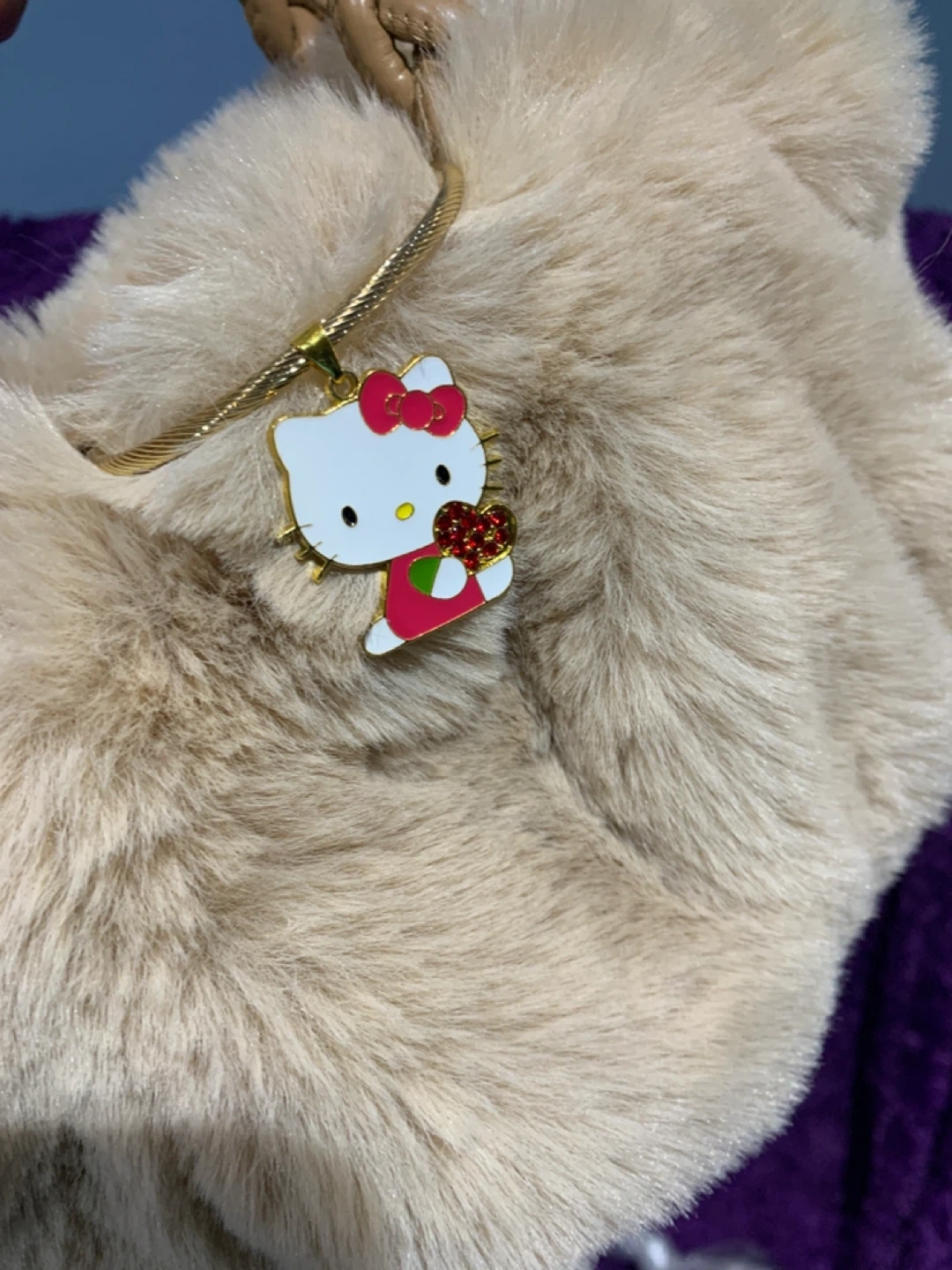 Cream-coloured faux fur handbag with braided faux leather handles. It features a cute Hello Kitty charm with a red heart. Interior is lined.