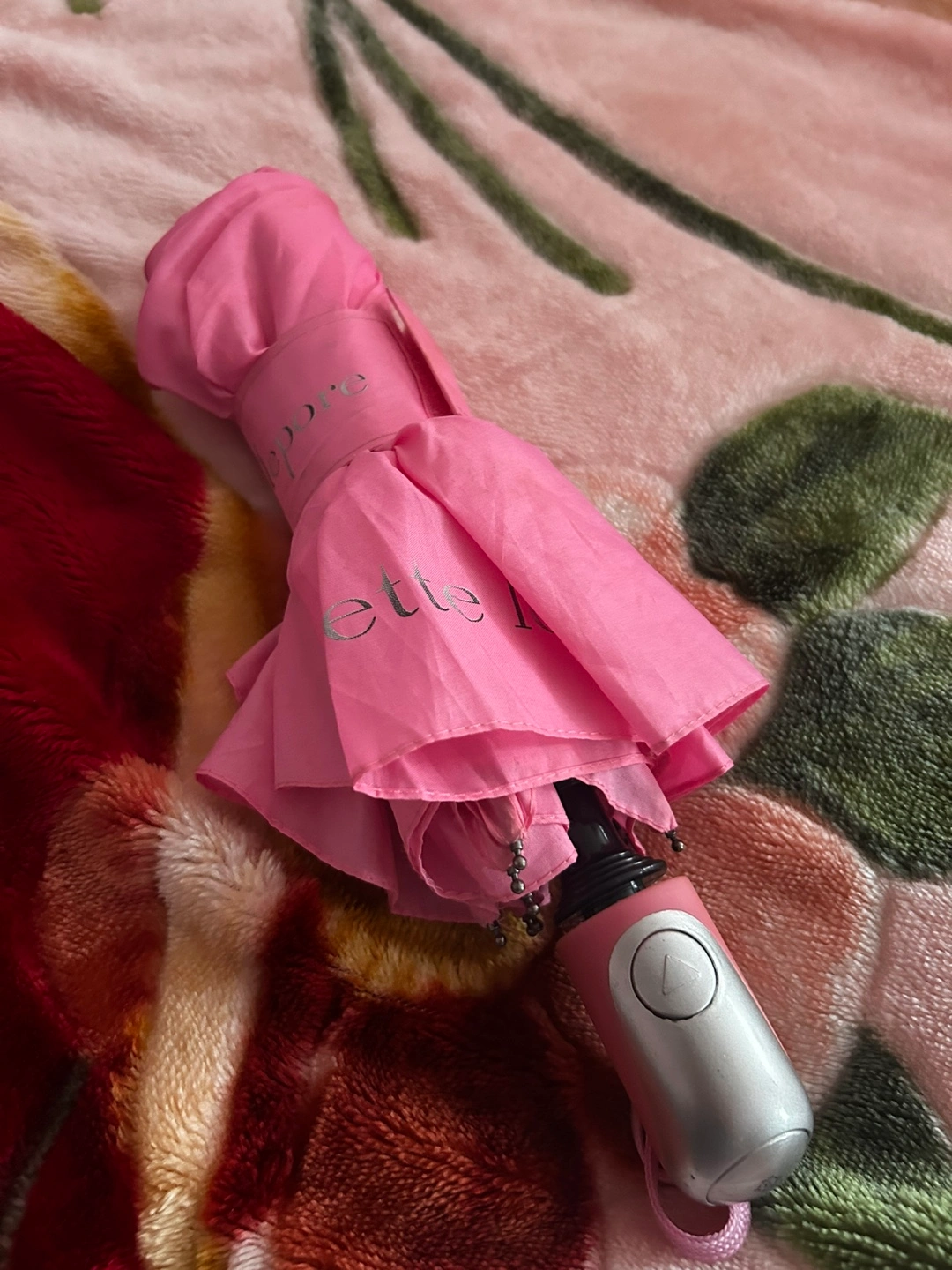 Compact pink umbrella, folds down small for easy carrying. Silver handle with a button open and closure. Perfect for unexpected rain showers!