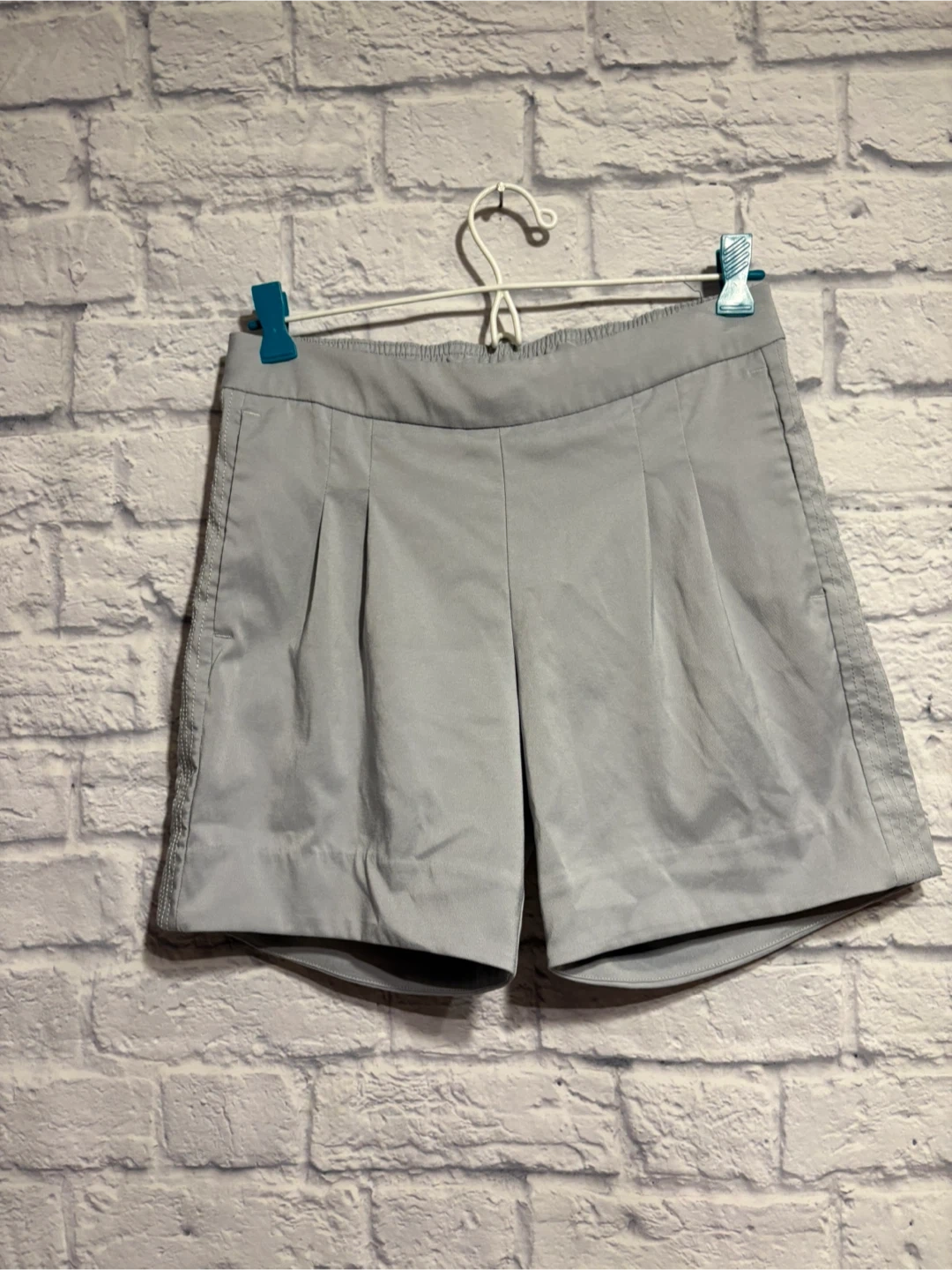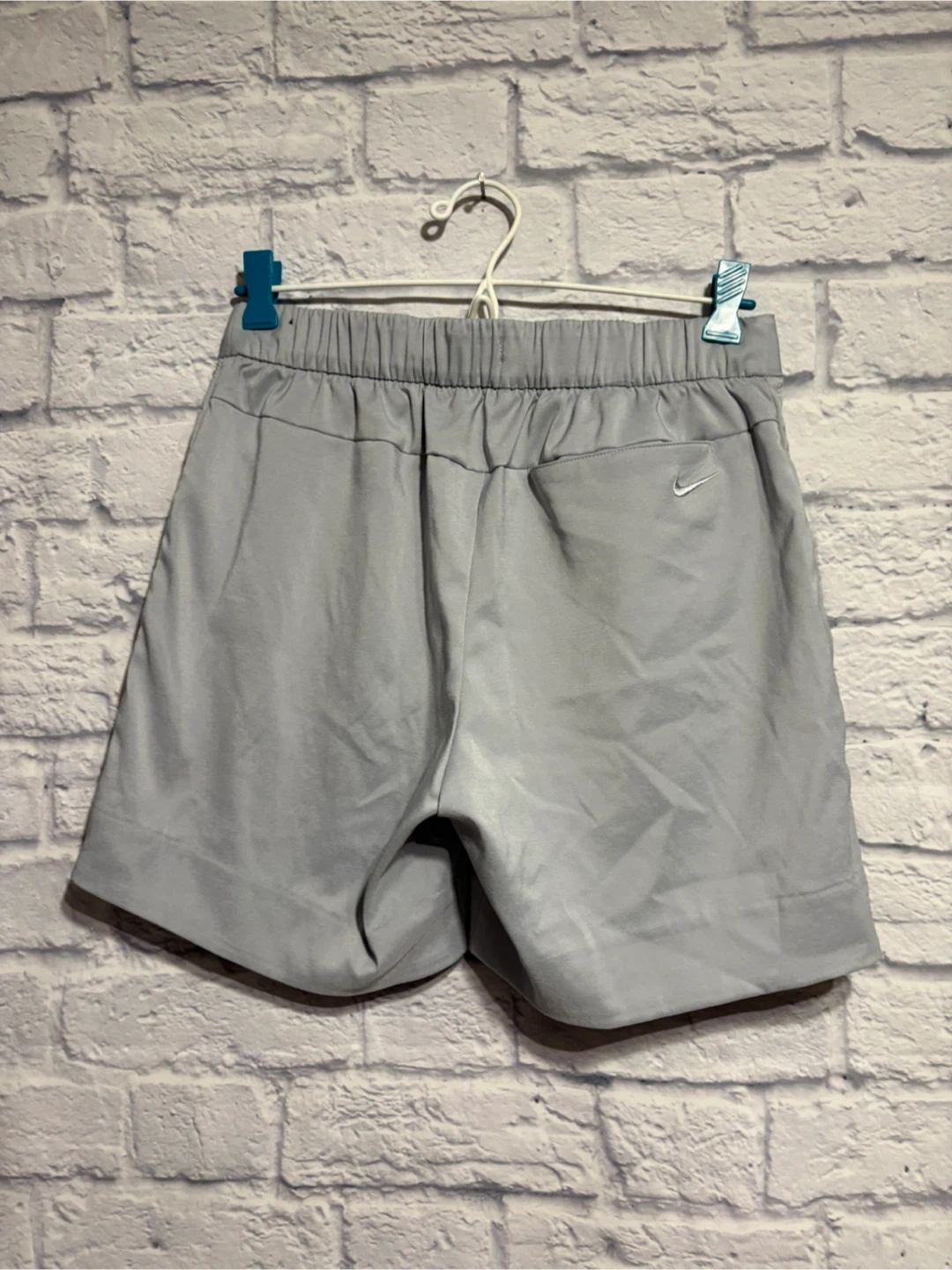 These Nike shorts are a light grey colour. They feature a pleated front and elastic waistband. The back has a small Nike swoosh logo. Gently worn. Pick up only.