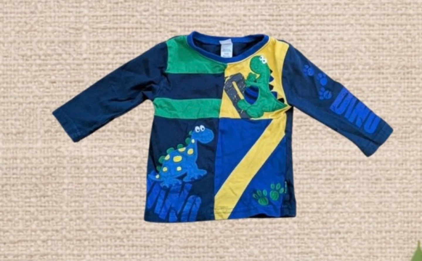 A playful and colorful Little Tikes long‑sleeve shirt featuring a fun patchwork design and adorable dinosaur graphics. The vibrant blue, green, and yellow colorblocking adds personality, while the friendly dinos and paw‑print details make it a standout piece for any little one who loves prehistoric fun. Soft, comfy, and easy to wear — perfect for daycare, playtime, or everyday outfits with character. Features: • Little Tikes long‑sleeve shirt • Colorblock design in blue, green, and yellow • Cute dinosaur graphics and “DINO” text • Soft, comfortable fabric • Size 12–18 months • Made in China Condition: Excellent pre-loved condition.
