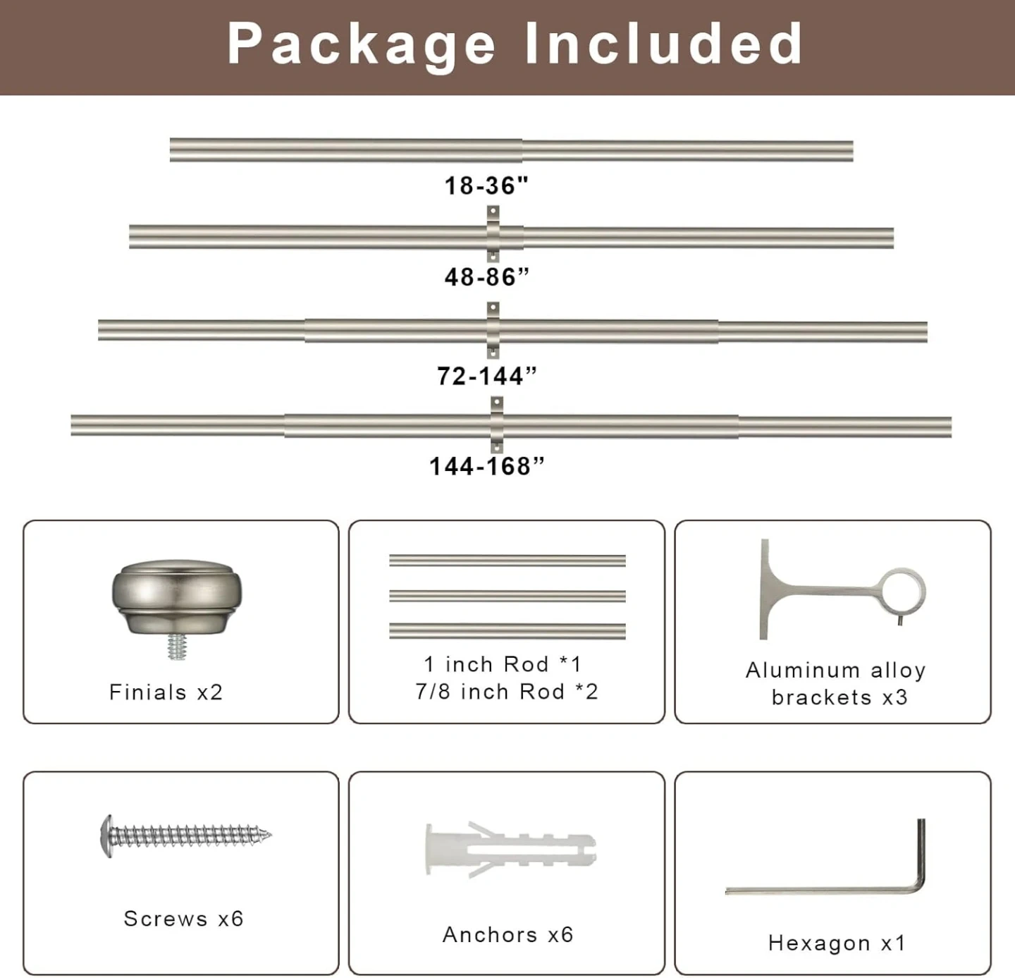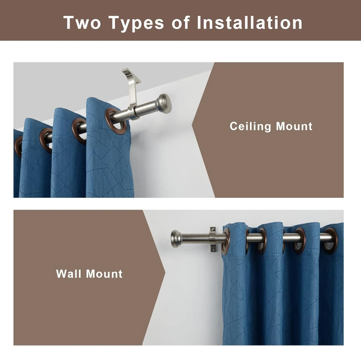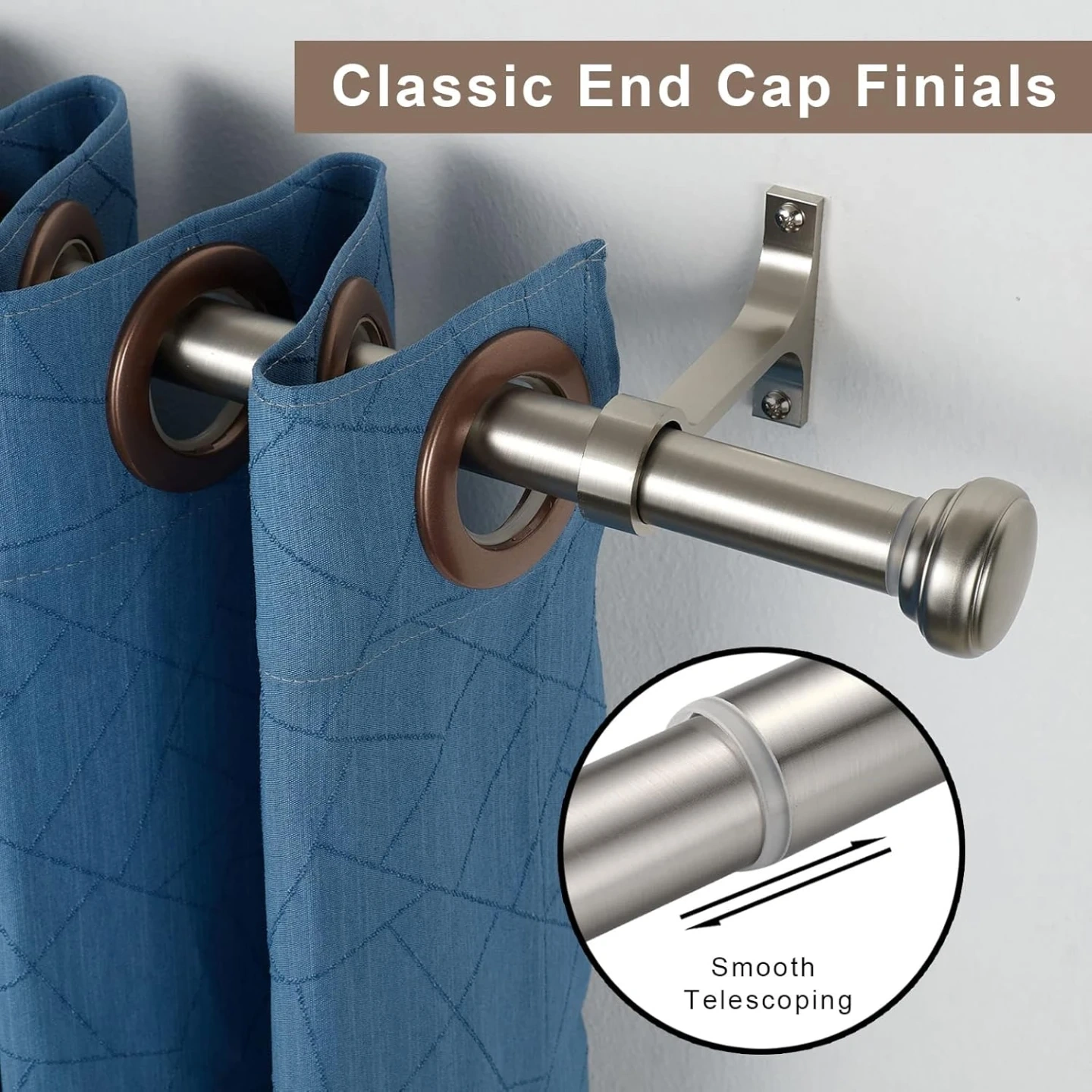 This heavy-duty curtain rod is made from aluminum alloy and can hold up to 30 pounds. It features smooth telescoping for adjustable length, classic end cap finials, and two installation options: wall mount or ceiling mount. Includes all necessary hardware like screws and anchors.