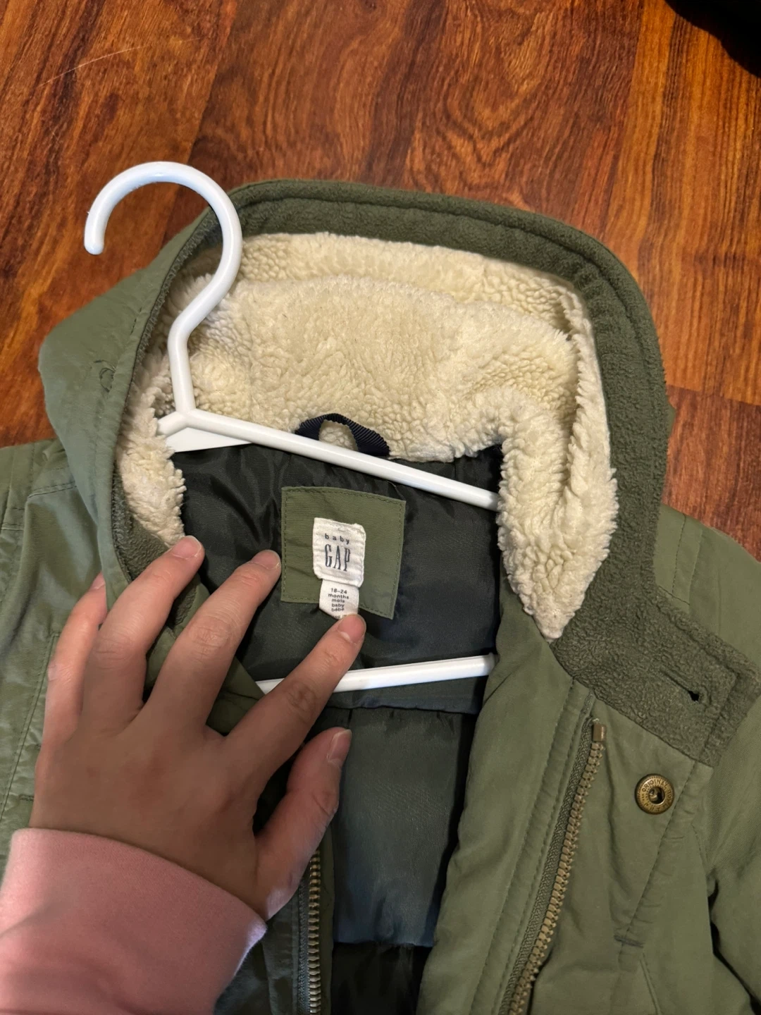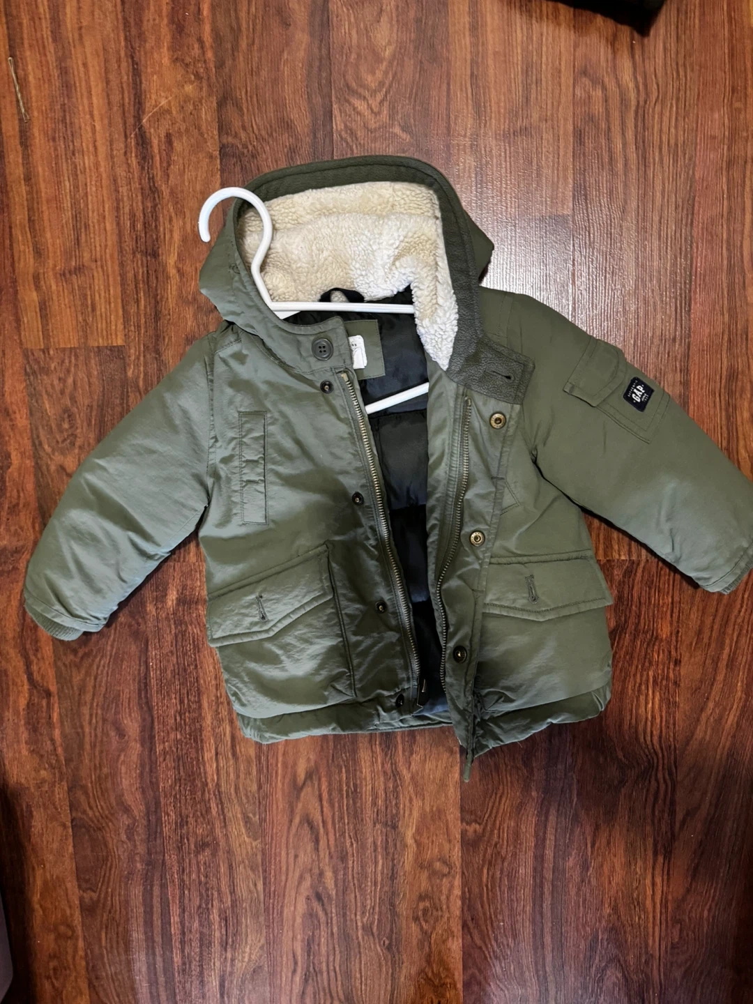 This Gap baby winter jacket is a cozy, hooded parka in a classic green colour. It's lined with a warm sherpa material for extra comfort. Size 18-24 months
