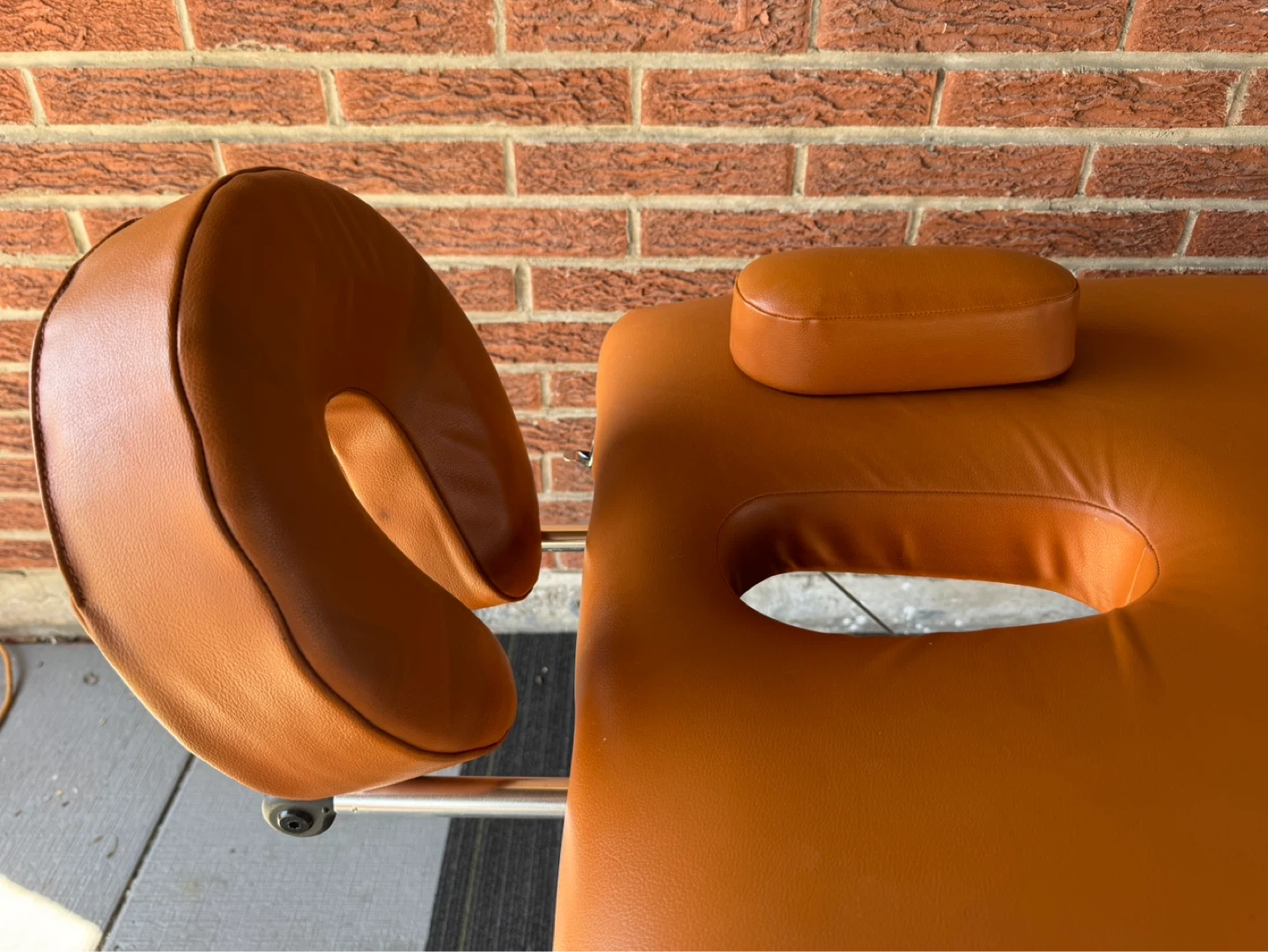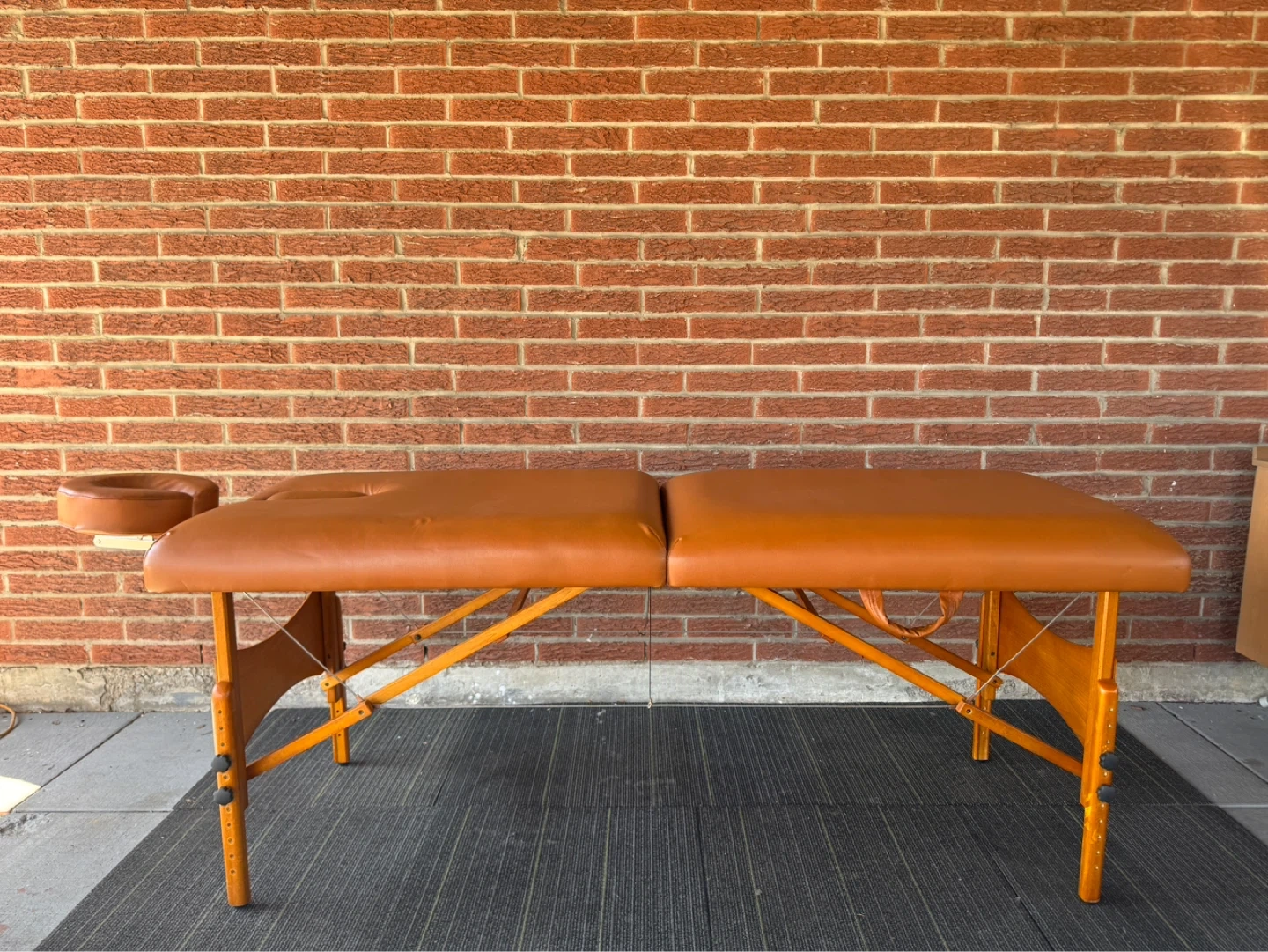 This is a Master brand portable massage table in a brown colour. It includes a removable face cradle and armrest. The table folds up for easy transport and storage.