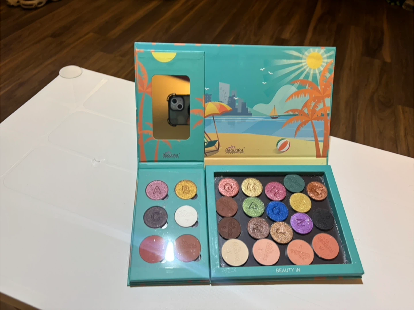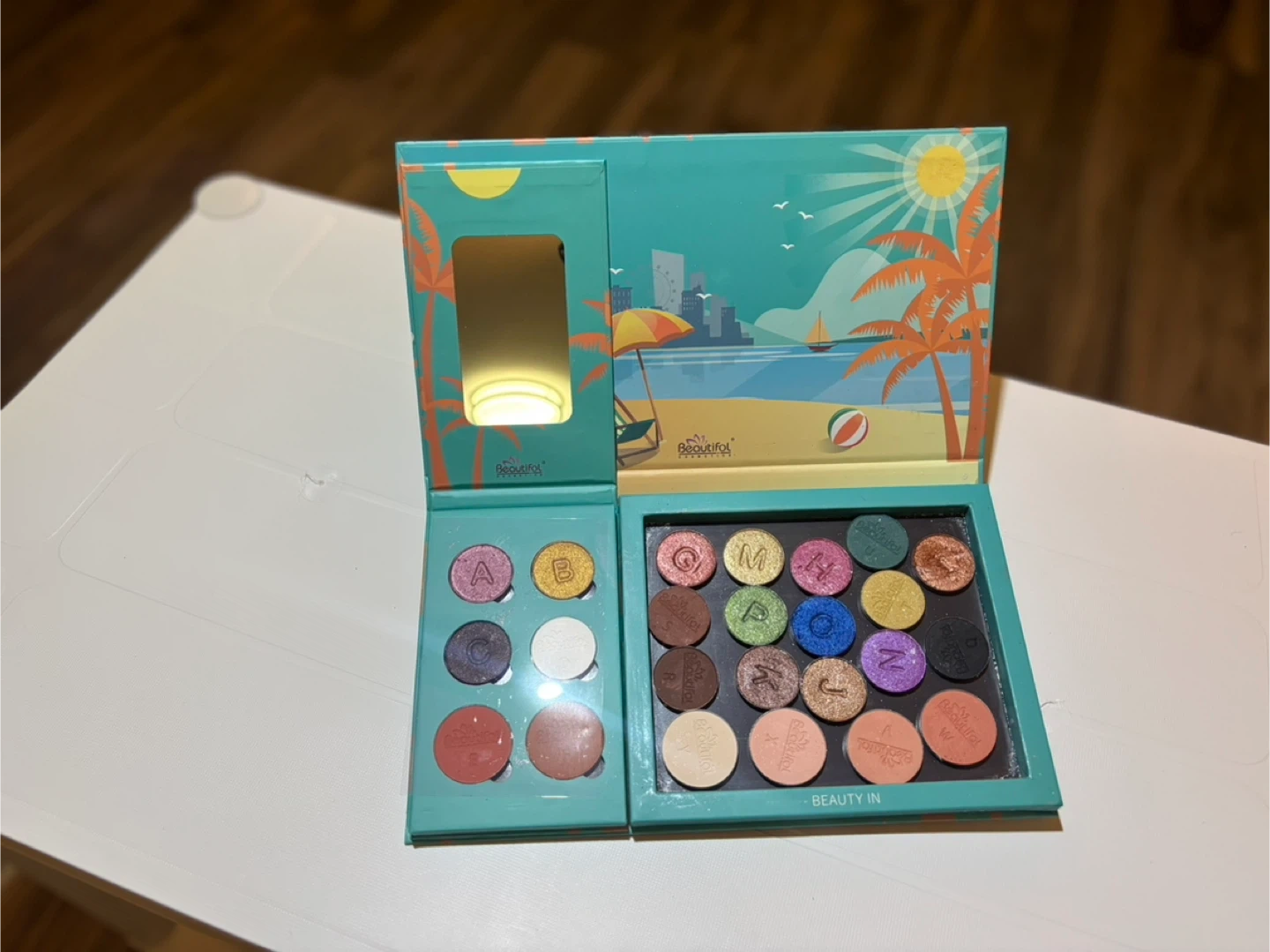 This is a Beauty Creations eyeshadow palette with a vibrant beach-themed design. It contains a variety of eyeshadow shades. The palette is designed for makeup application.