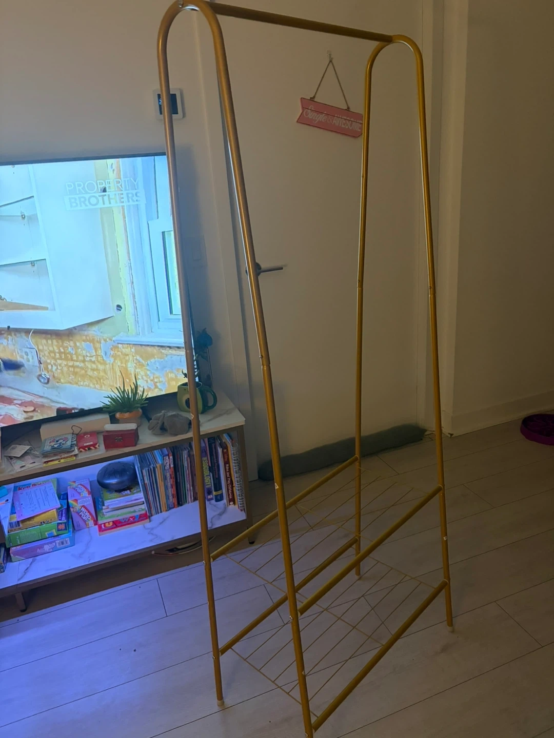 This gold metal garment rack is perfect for hanging clothes and storing accessories. It features a sturdy frame with two shelves for additional storage space. It's a practical addition to any bedroom or closet!