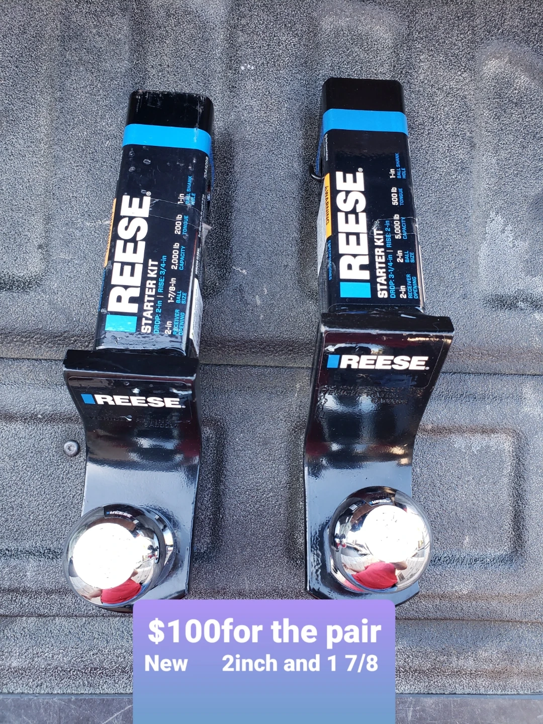 This is a pair of new Reese starter kit trailer hitches. One hitch has a 1-7/8 inch ball with a 2,000 lb capacity and a 2-inch receiver opening. The other hitch has a 2-inch ball with a 5,000 lb capacity and a 2-inch receiver opening. Both are designed for towing.