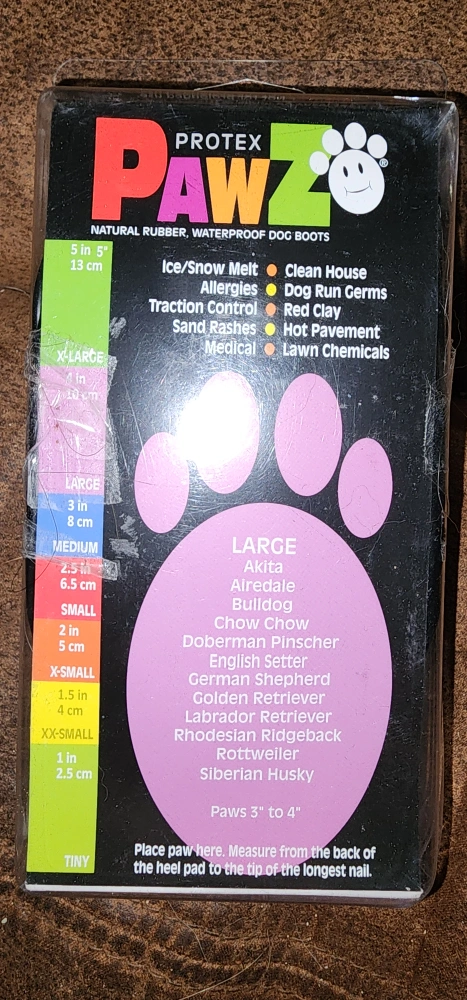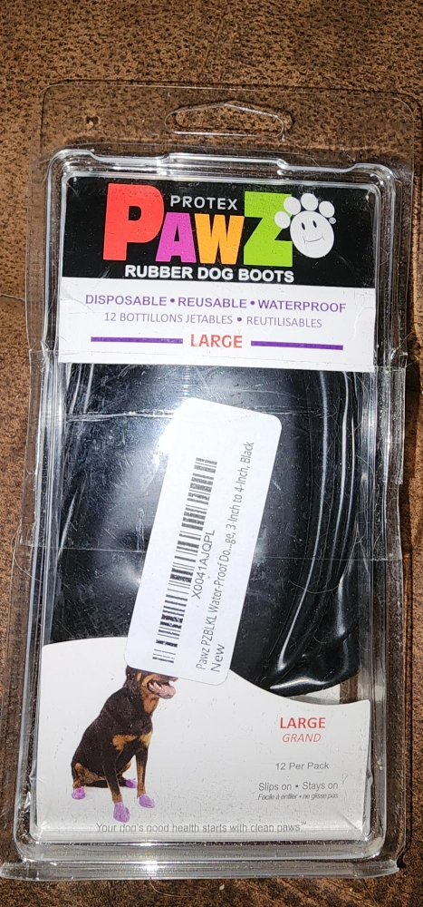 Pawz Rubber Dog Boots in size Large! These are disposable, reusable, and waterproof, keeping your dog's paws clean and protected. They're great for ice, snow, allergies, and more. Each pack contains 12 boots. They easily slip on and stay on!