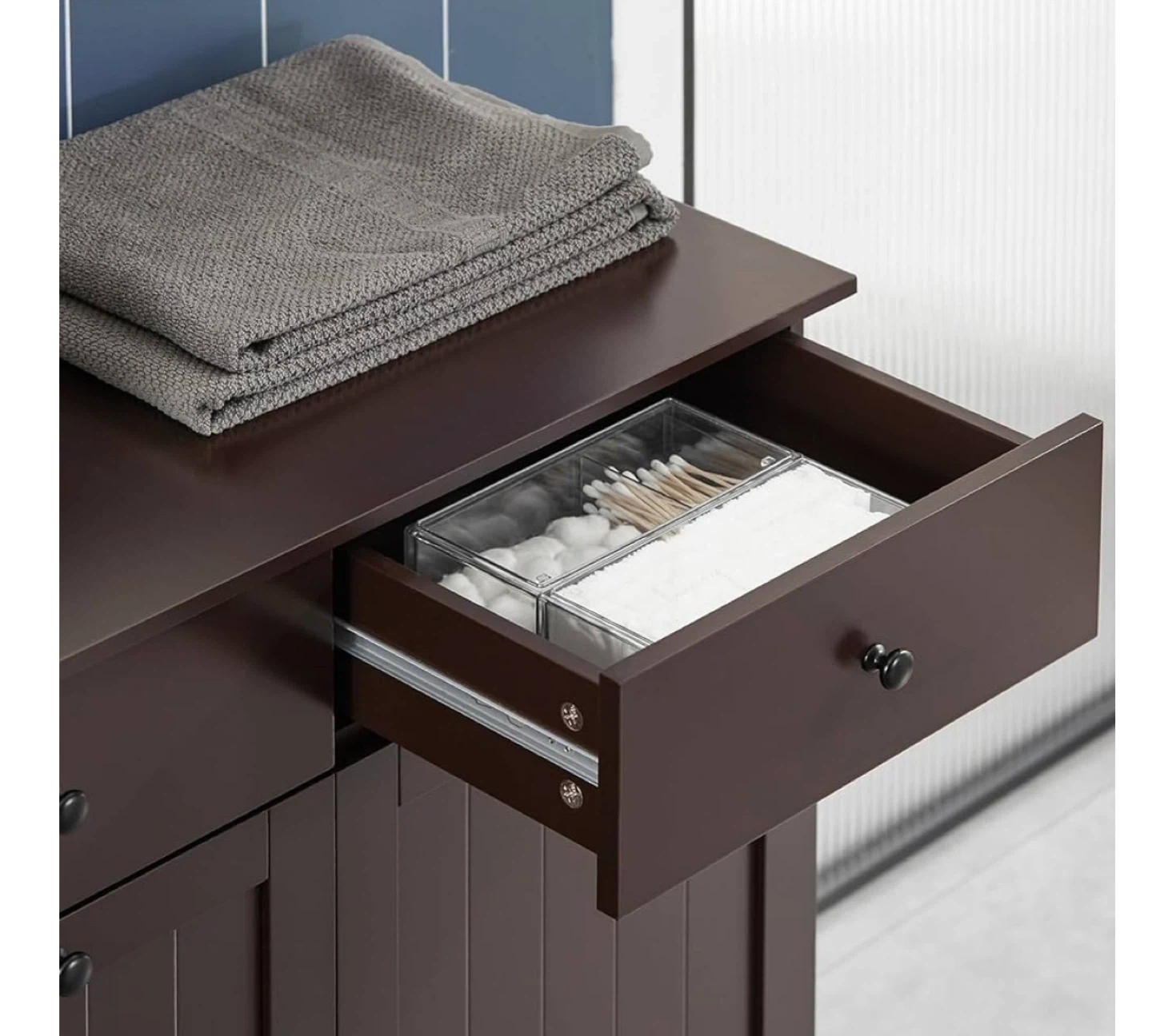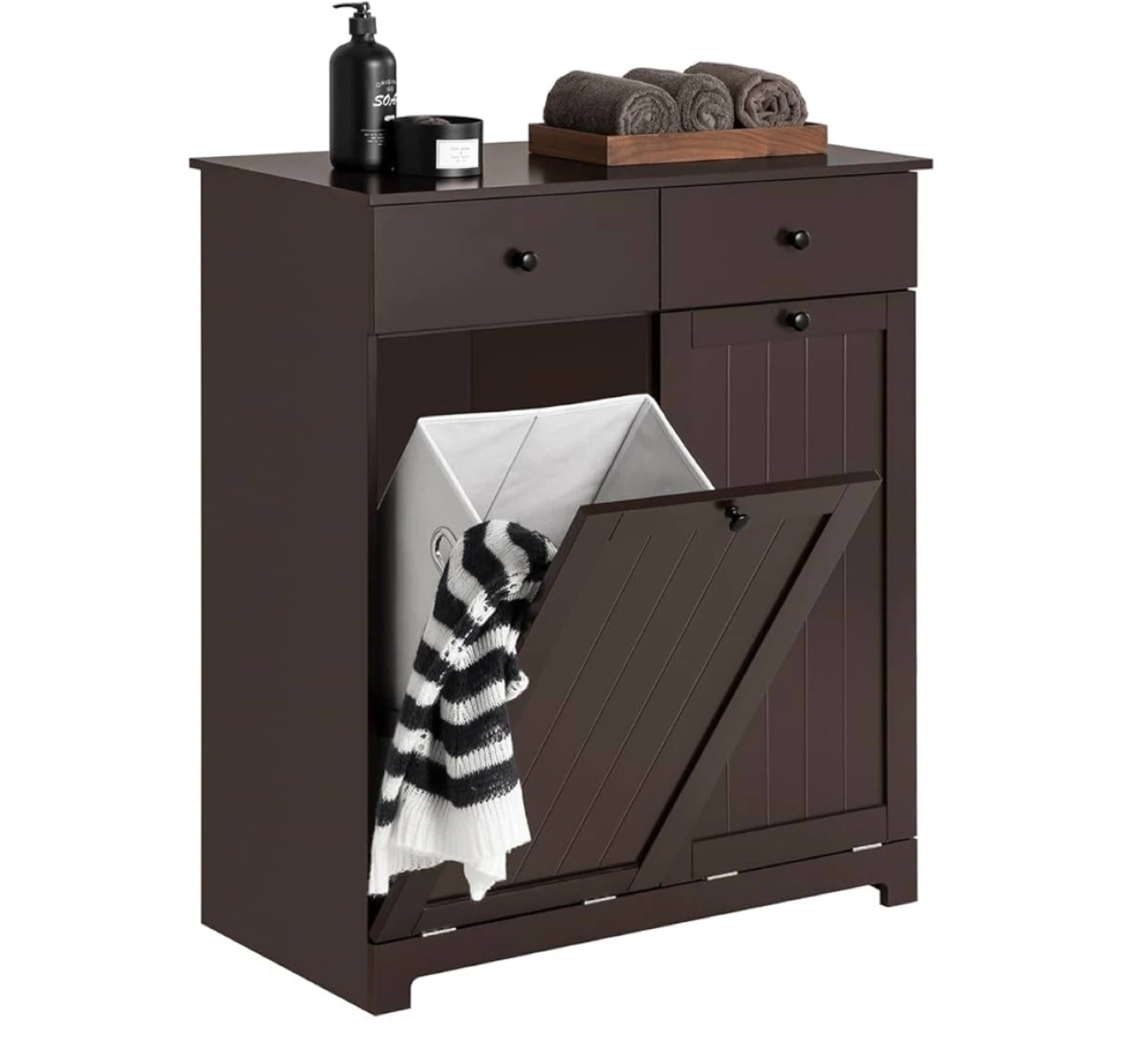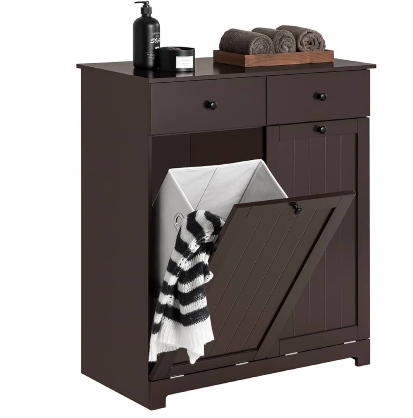This is a nice brown bathroom cabinet with a built-in laundry hamper. It also has two drawers for extra storage. Great for keeping your bathroom tidy and organized