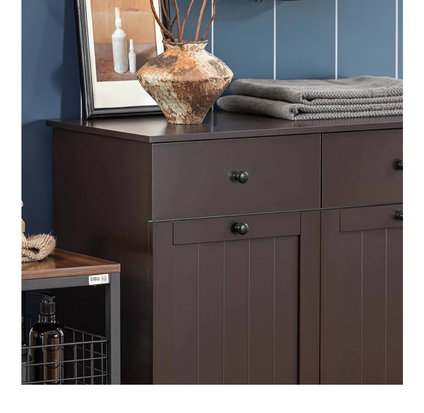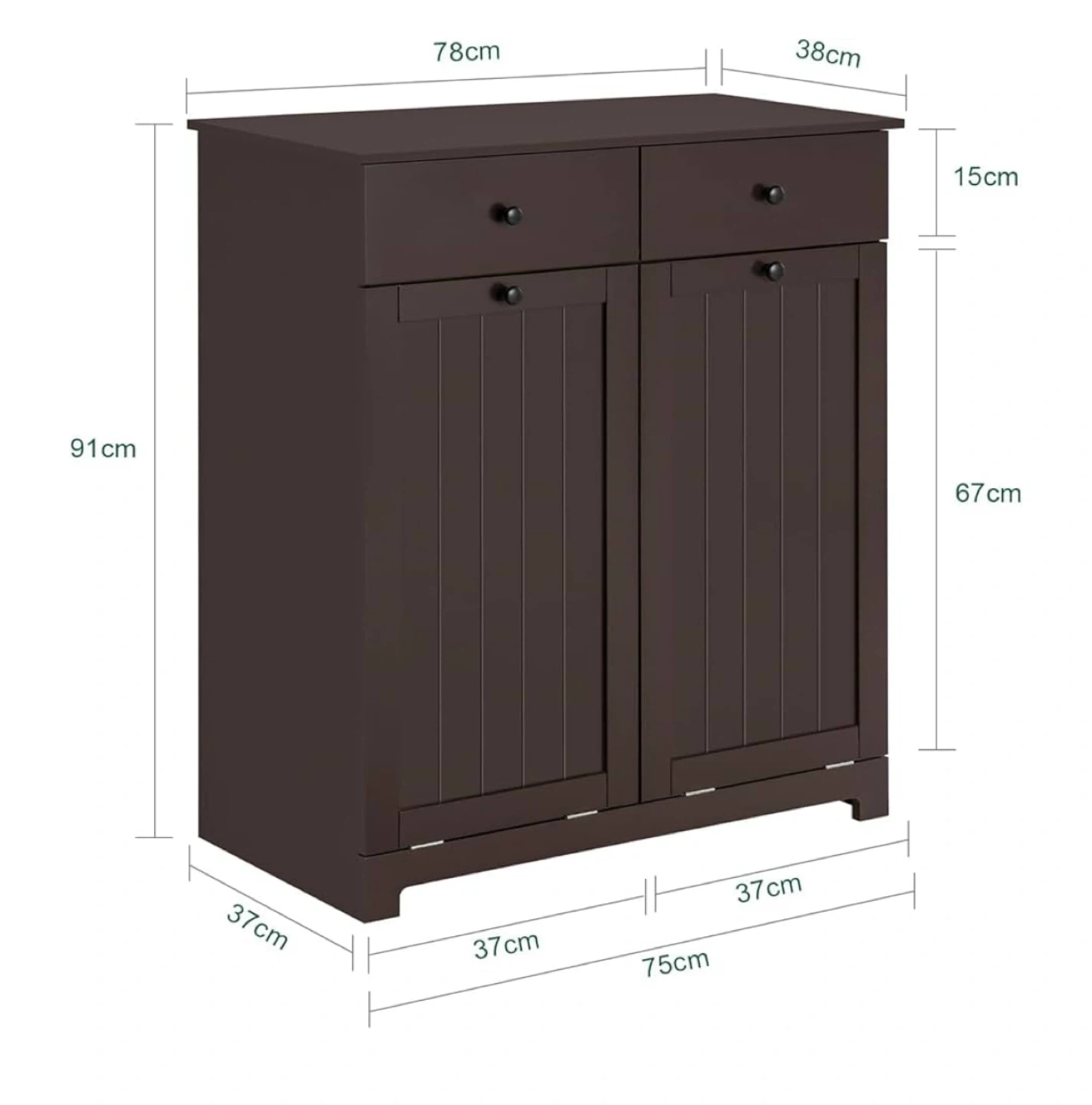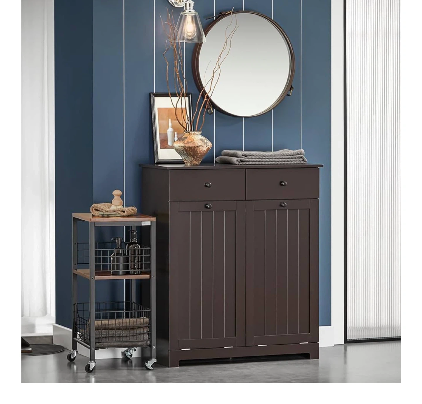 This is a nice brown bathroom cabinet with a built-in laundry hamper. It also has two drawers for extra storage. Great for keeping your bathroom tidy and organized