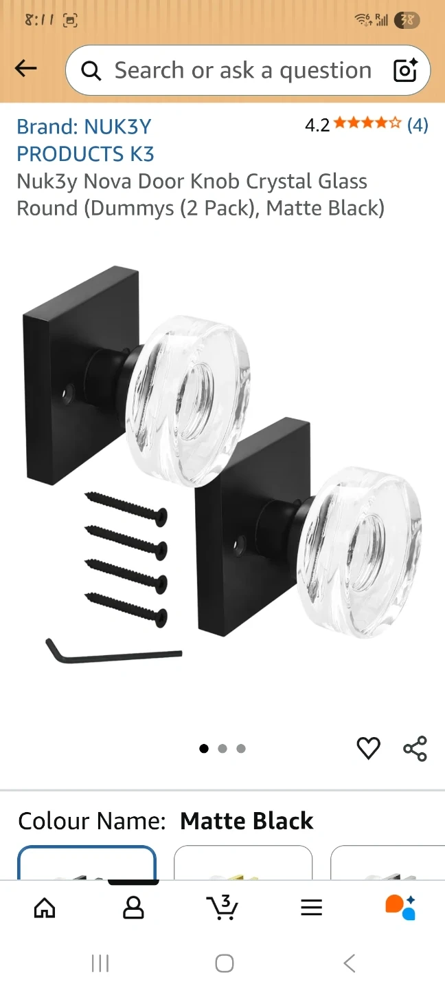Set of two NUK3Y Nova crystal glass door knobs with matte black bases. Includes mounting screws. Measures 2.5" x 2.5" square base, knob is 2.5" height and 0.875" projection. These are dummy knobs, meaning they don't latch and are typically used for closets or as decorative pulls.
