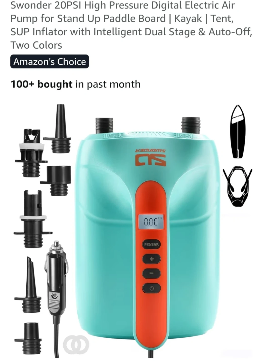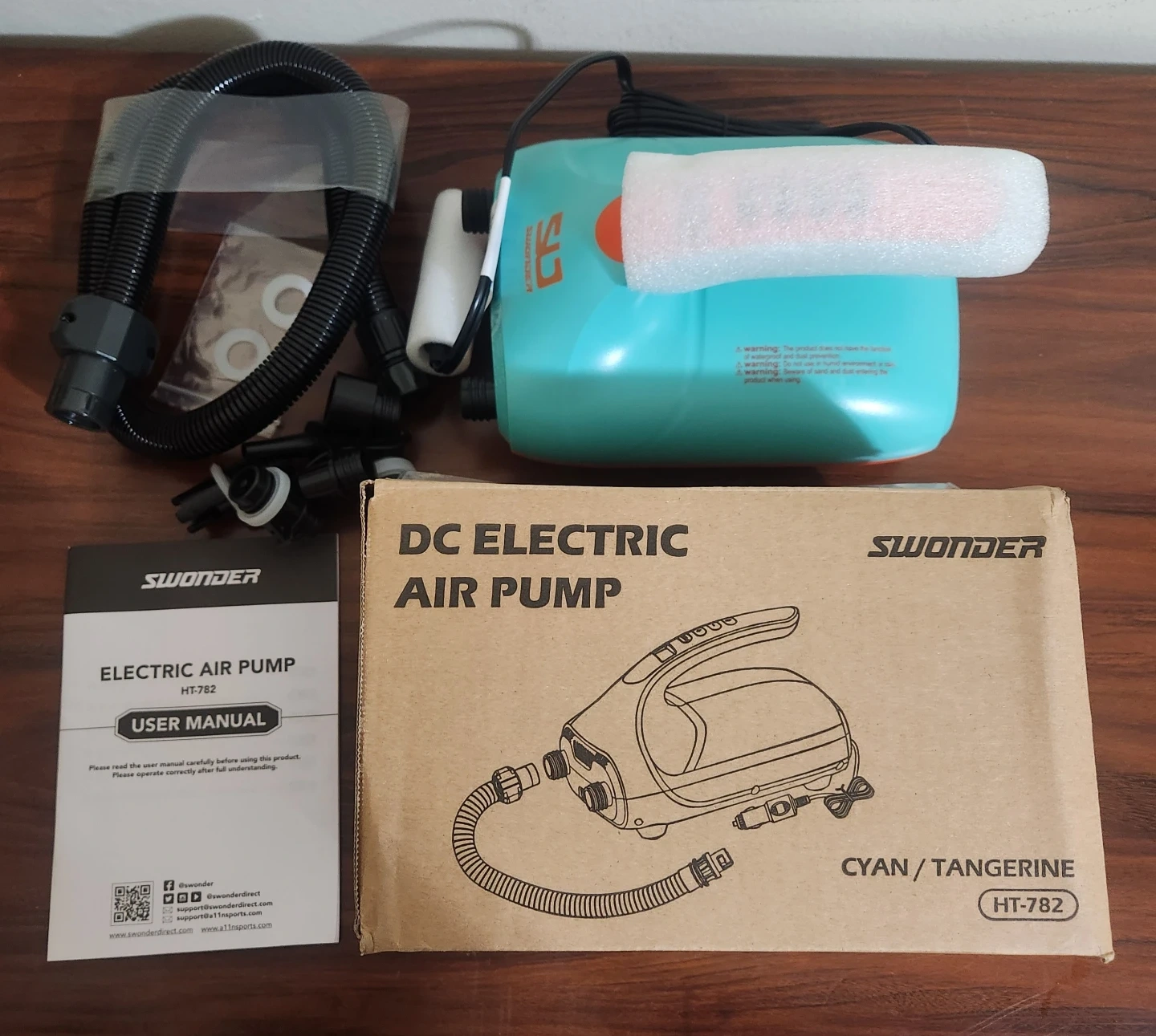 Selling a Swonder DC Electric Air Pump, model HT782, It's perfect for paddle boards, kayaks, and tents and other stuff. The box, user manual and all the parts are included, so you'll have everything you need to get started. It is new and unused. Originally it costs $120 in Amazon but they have a 38% off that makes it $74.99
