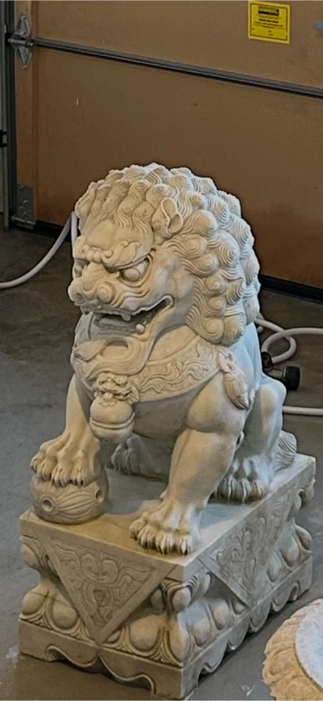 This is a decorative stone statue of a Foo dog, also known as a guardian lion. It's carved with intricate details on its mane, face, and the base it sits on. This piece would make a striking accent for a garden or entryway. Stone construction.