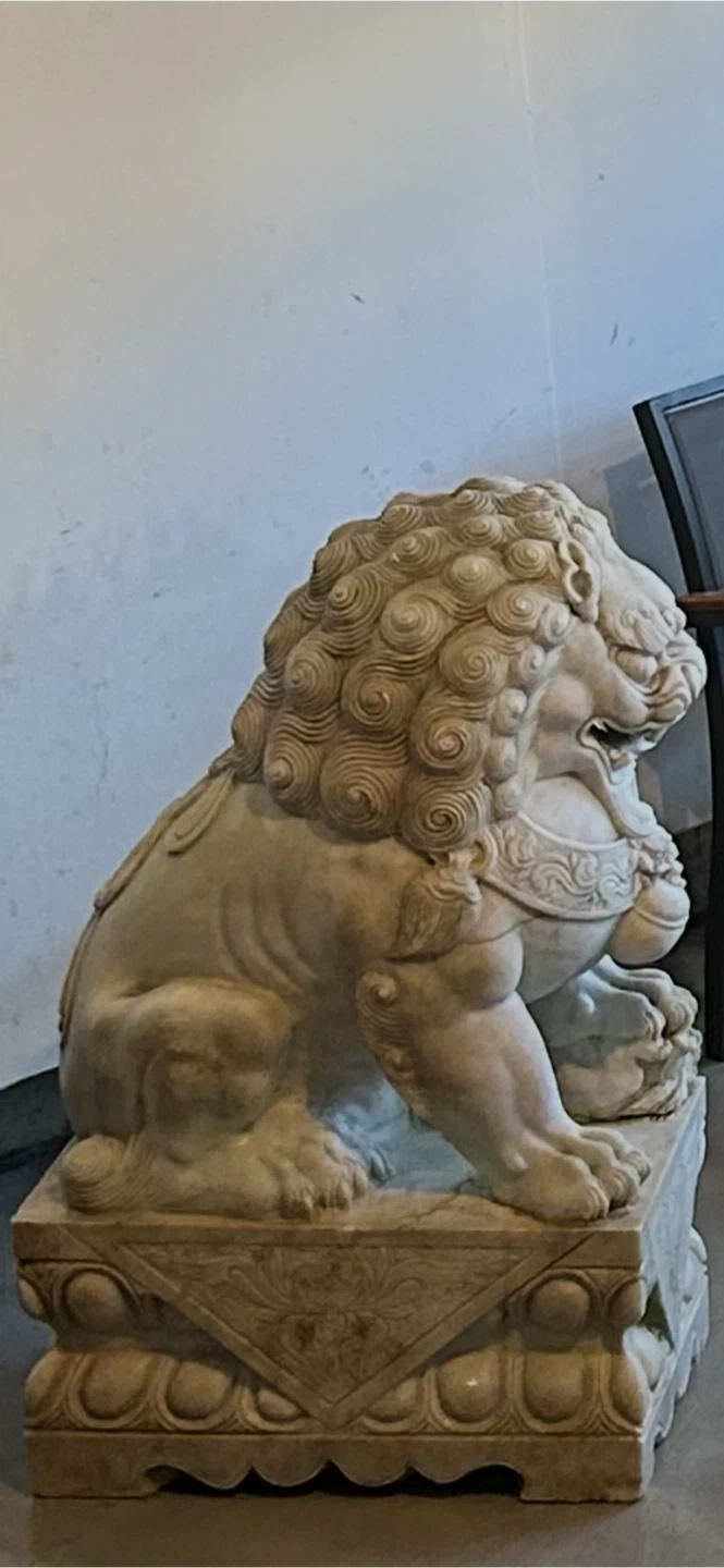 This is a decorative stone statue of a Foo dog, also known as a guardian lion. It's carved with intricate details on its mane, face, and the base it sits on. This piece would make a striking accent for a garden or entryway. Stone construction.