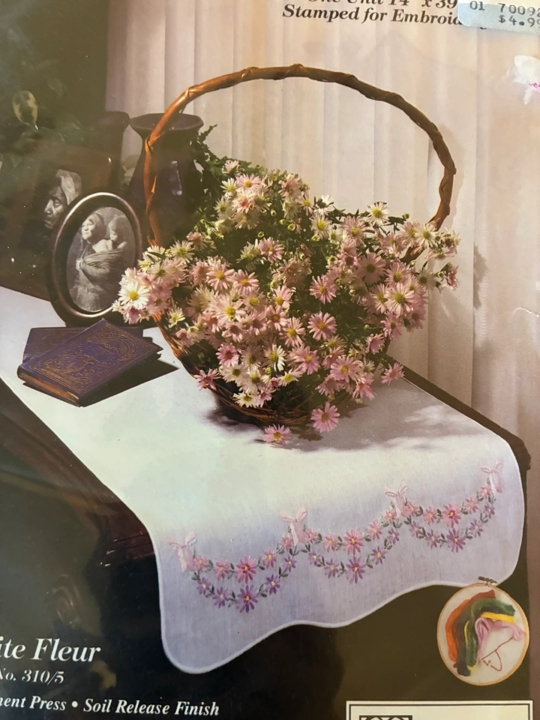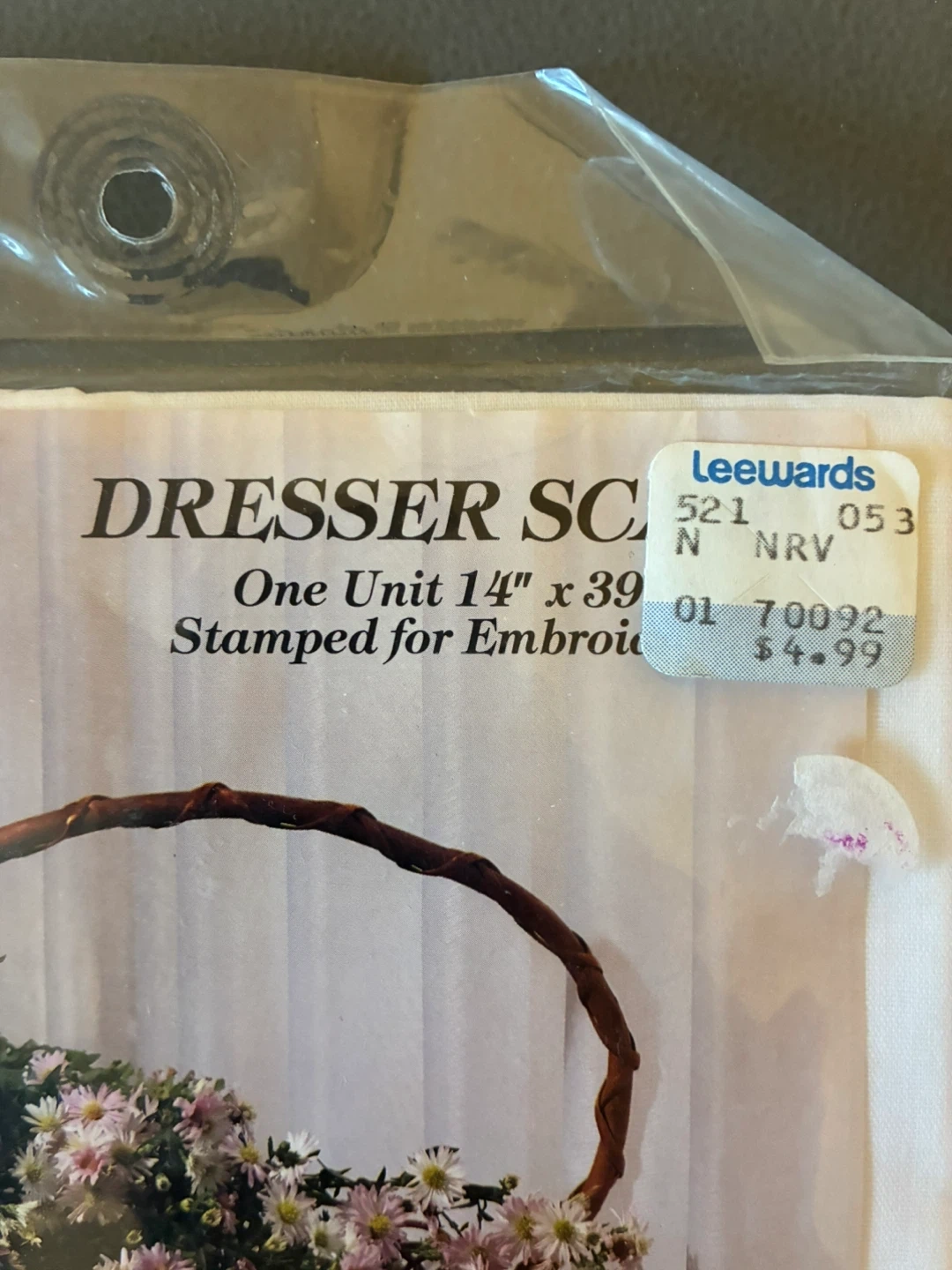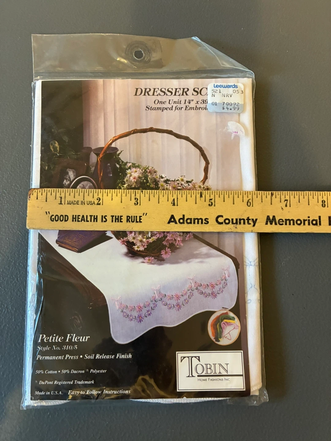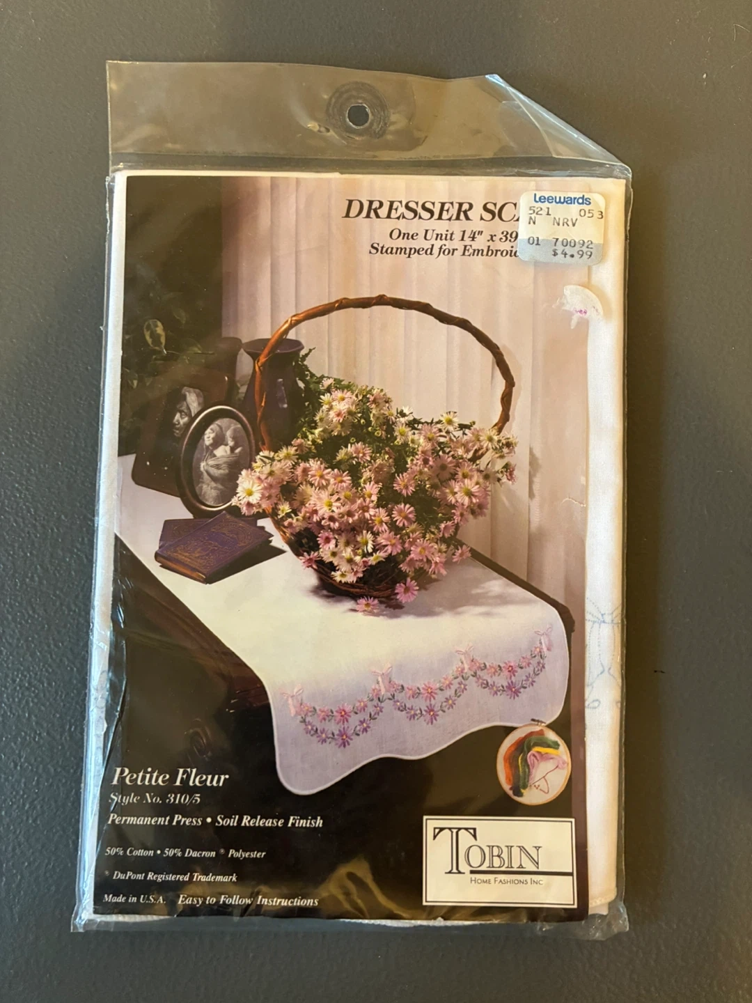 This is a Tobin Petite Fleur dresser scarf kit. It's stamped for embroidery and made of 50% cotton and 50% Dacron polyester with a permanent press and soil release finish. The scarf measures 14" x 39".