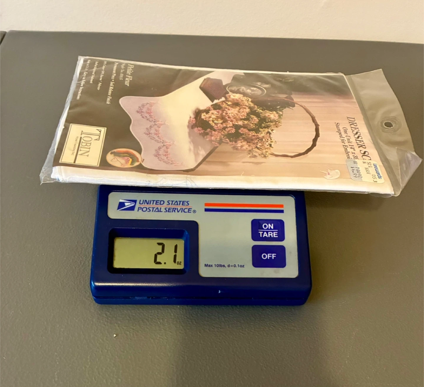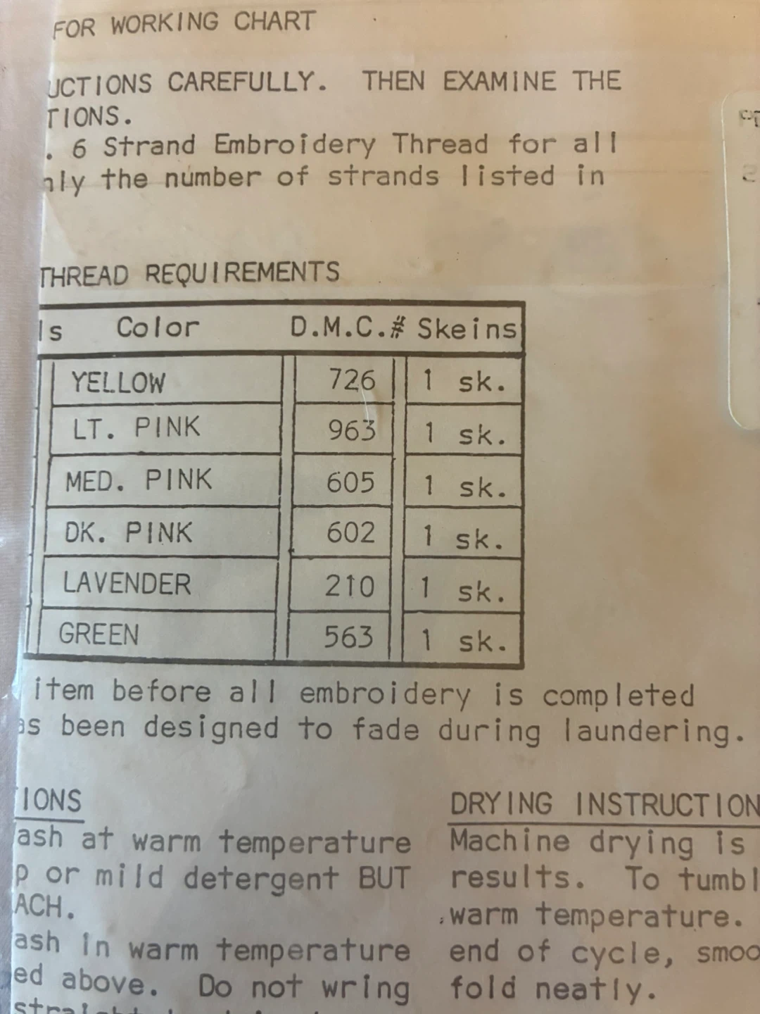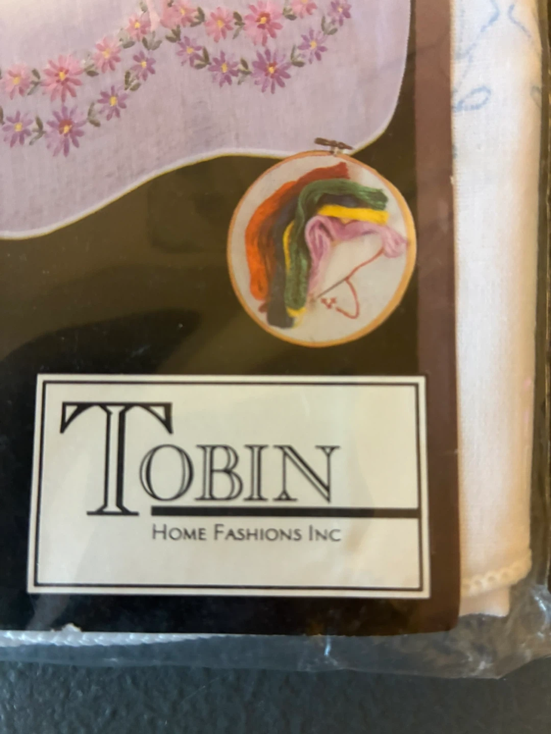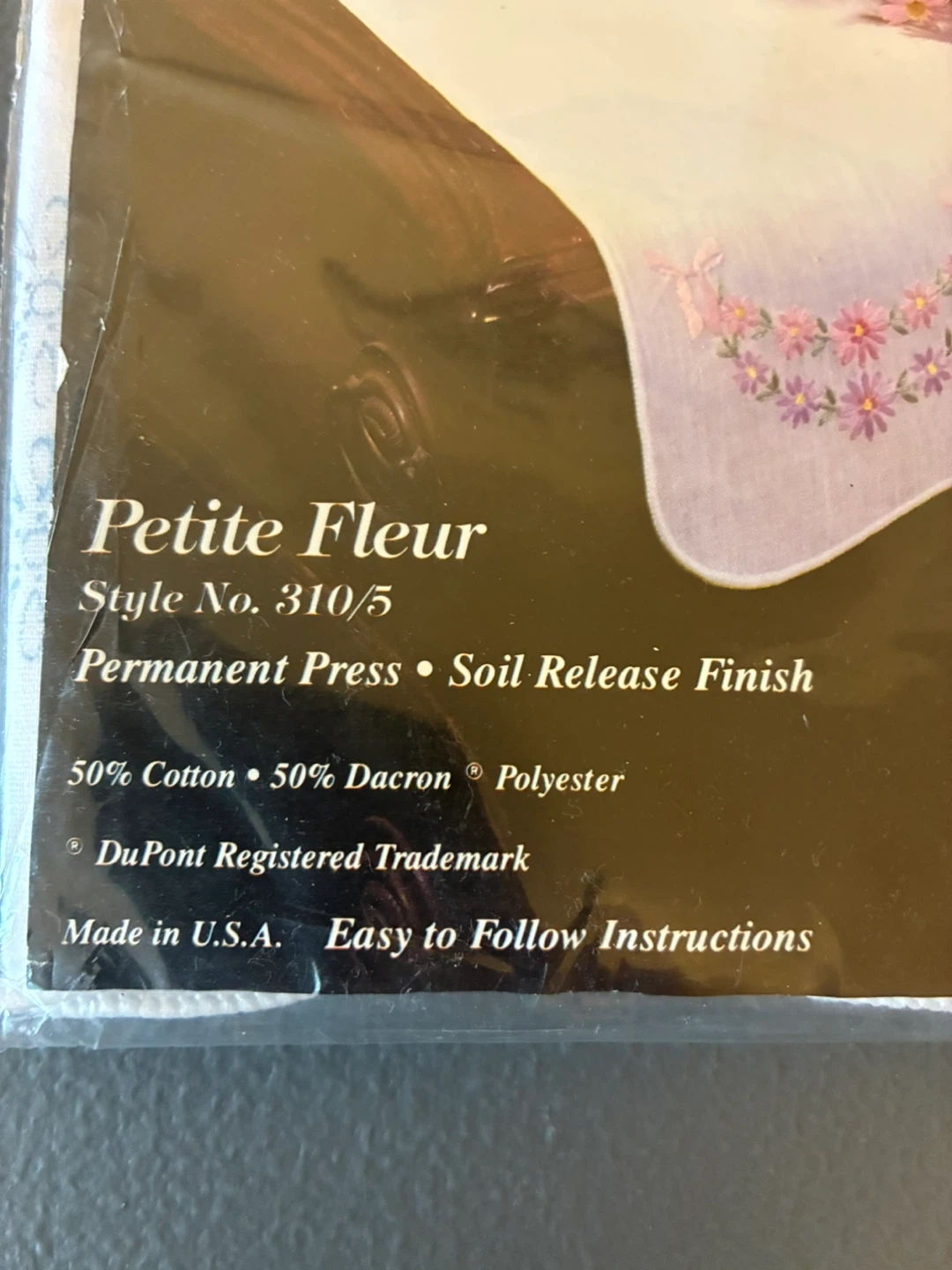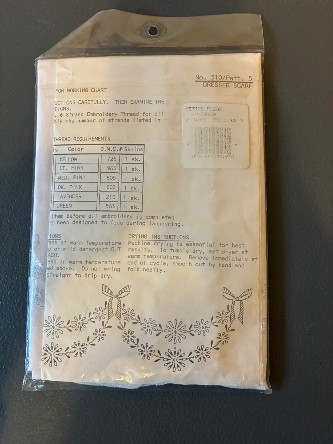 This is a Tobin Petite Fleur dresser scarf kit. It's stamped for embroidery and made of 50% cotton and 50% Dacron polyester with a permanent press and soil release finish. The scarf measures 14" x 39".