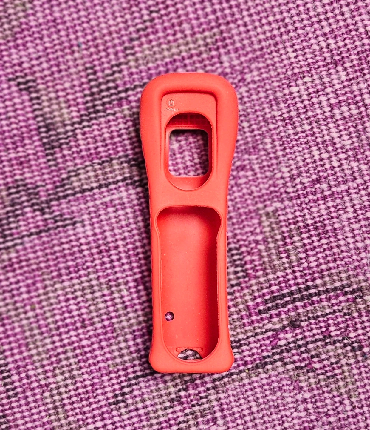 This is a red silicone grip case for a controller. The case has cutouts for buttons. Official Nintendo Wii Remote Protective Jacket (model RVL-022) designed to protect the controller and improve grip.