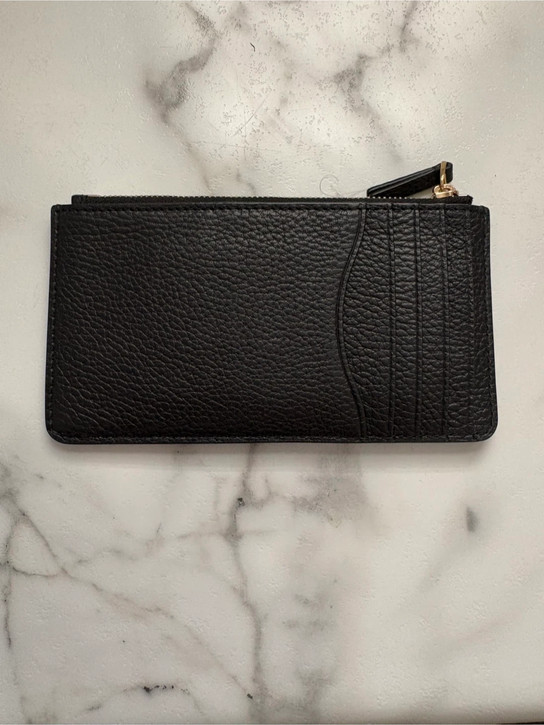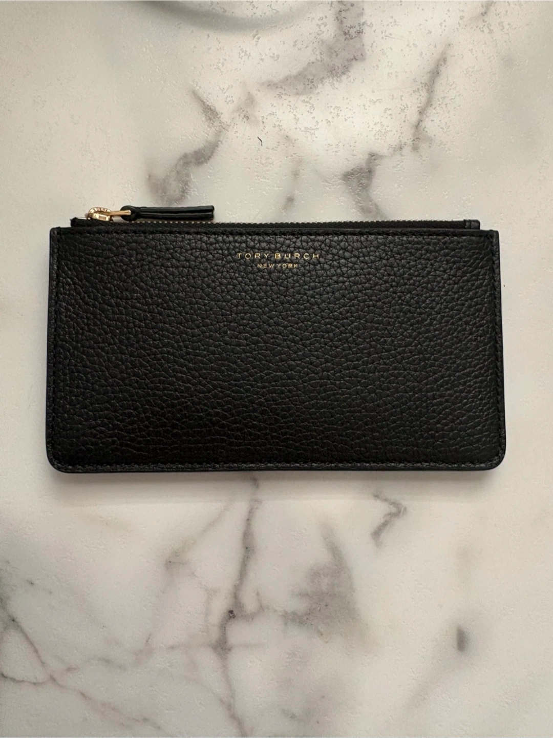 Tory Burch black pebbled leather card holder pouch. It has multiple card slots on one side and a zippered compartment for coins or small essentials. The gold-tone zipper and subtle logo embossing add a touch of class. It's a compact accessory for everyday use.