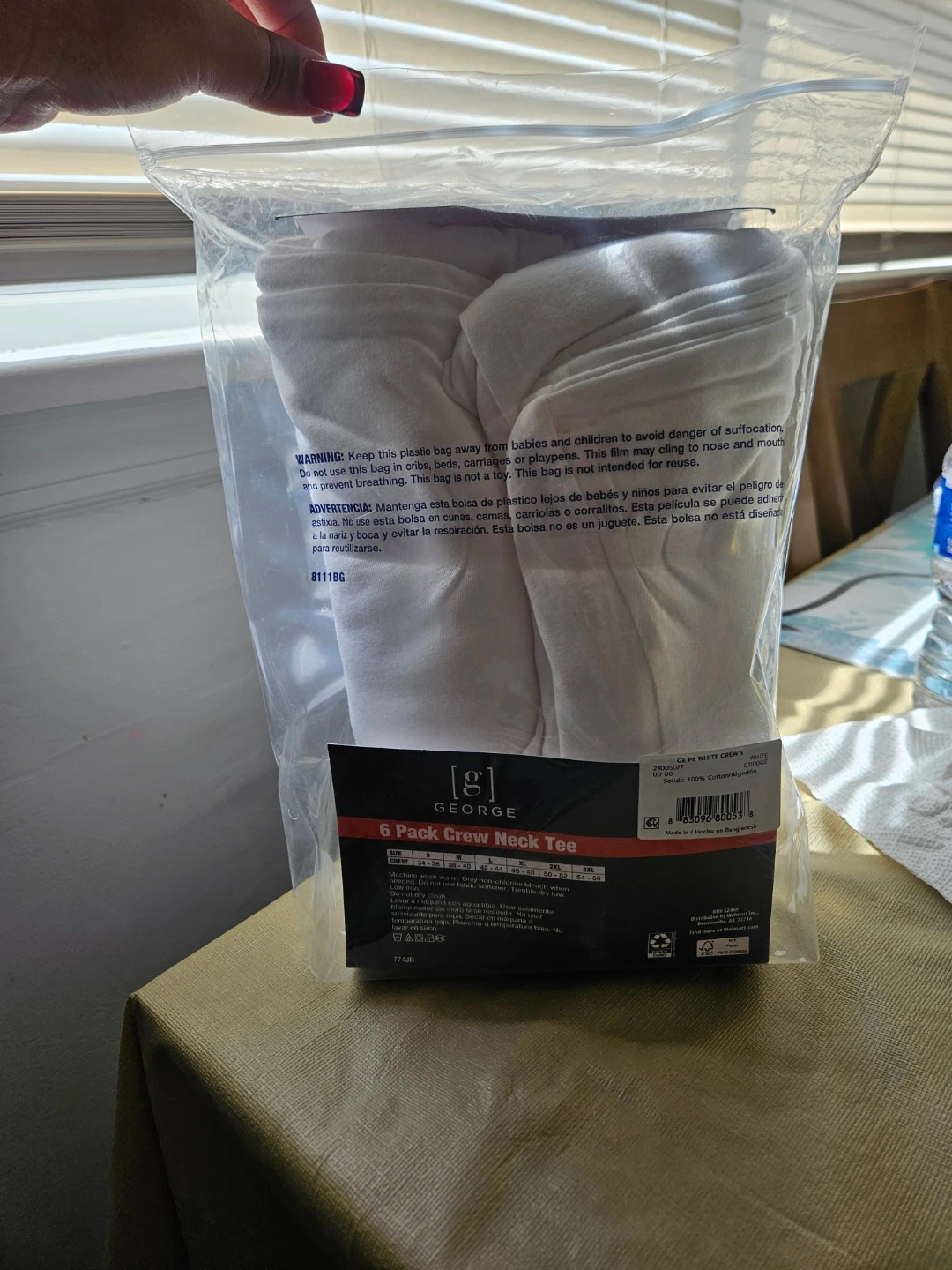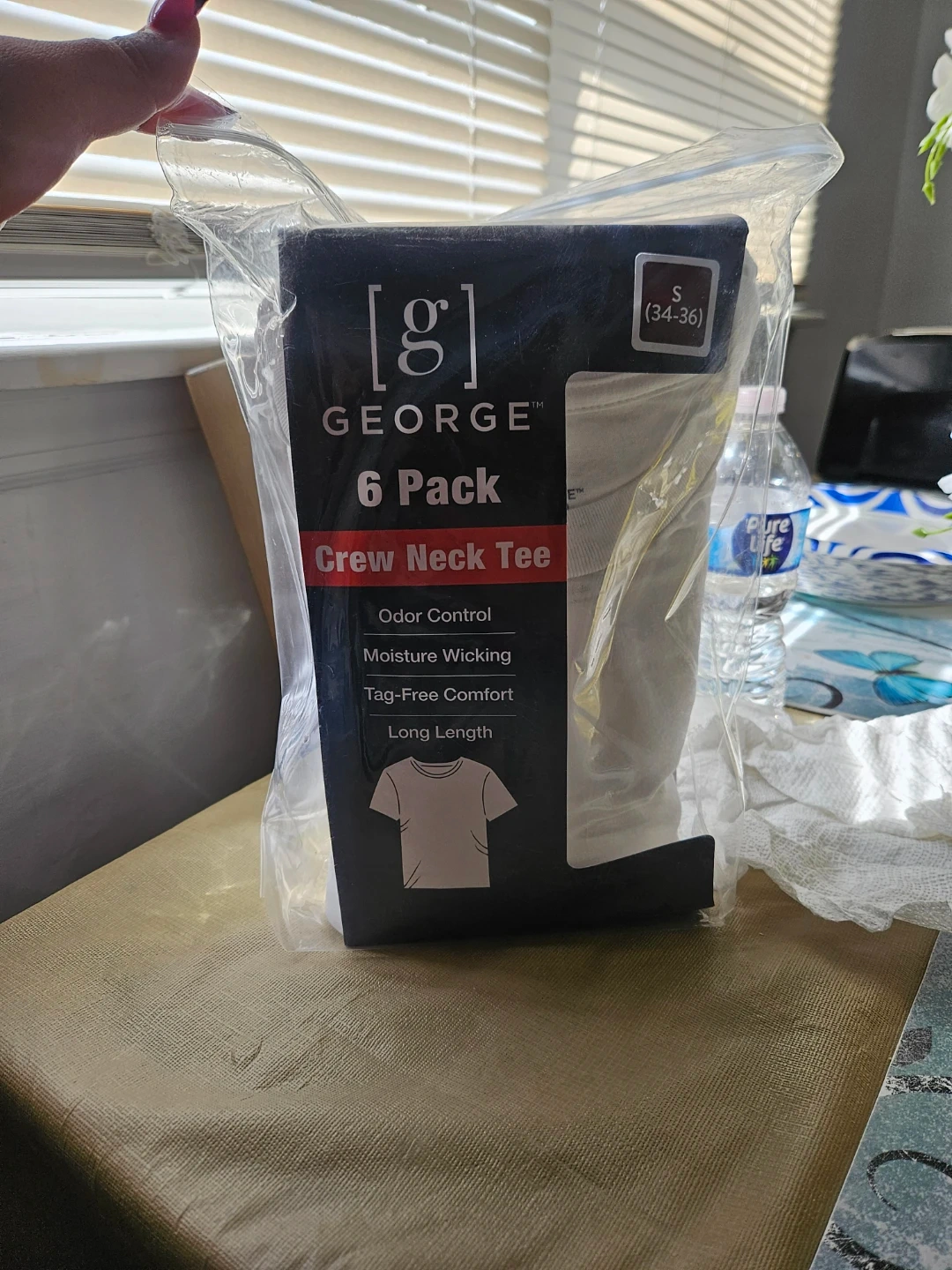George 6 pack of white crew neck tees. Features odor control and moisture wicking. Tag-free comfort for long wear. Made for size S (34-36).