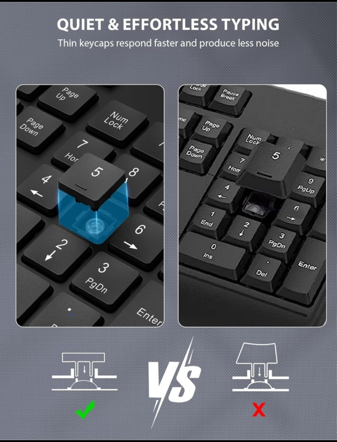 - Quiet & effortless typing with thin keycaps