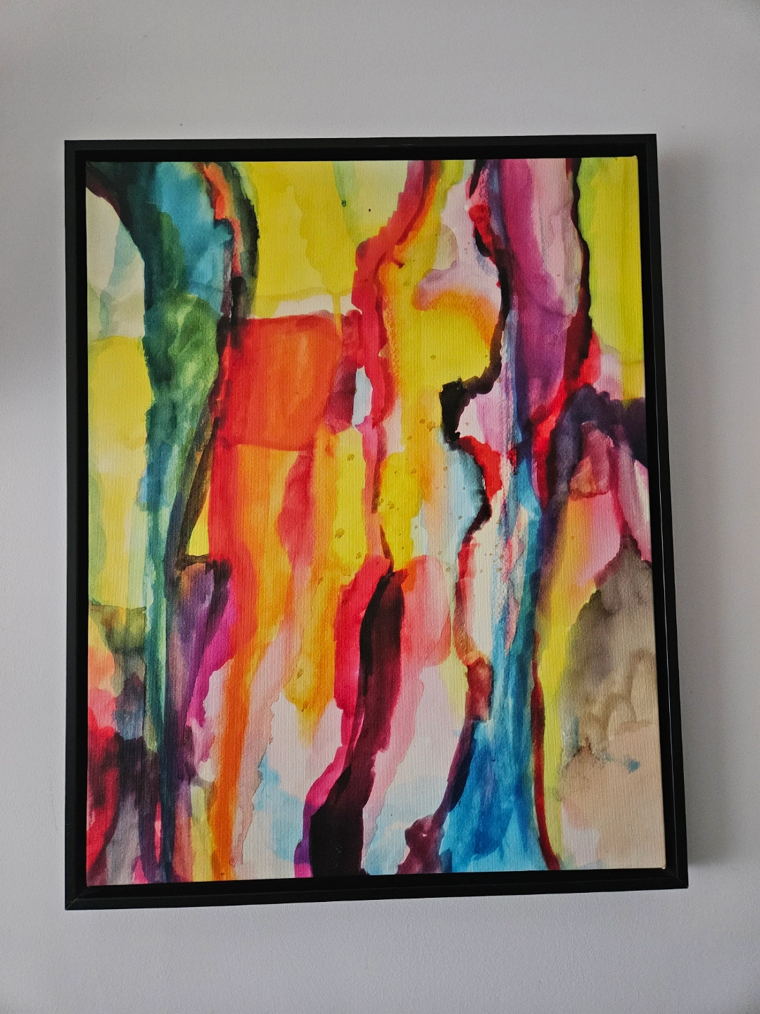 Framed colourful abstract artwork. Watercolour on canvas. Bold colours and fluid design. Great addition to any modern home.