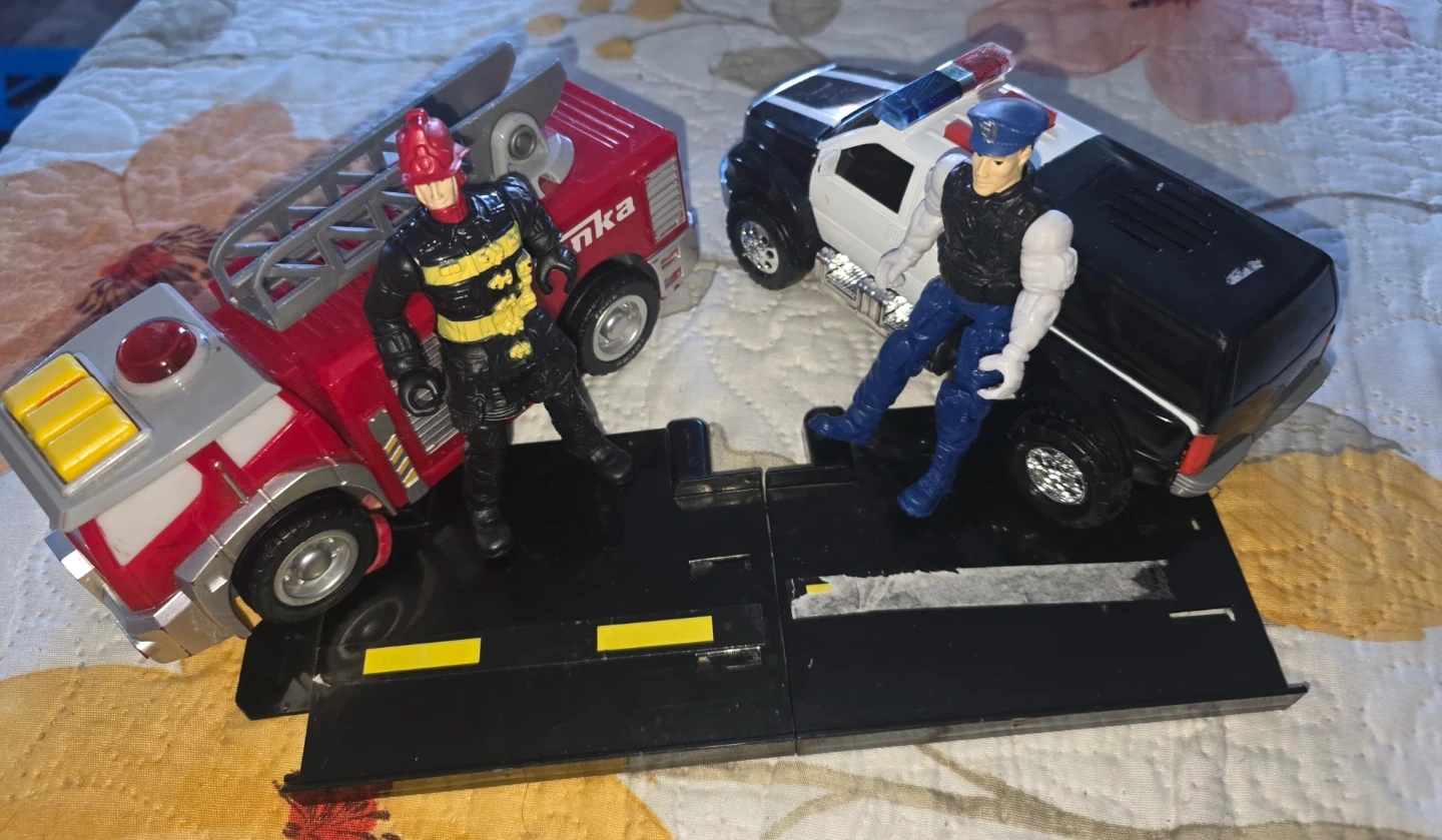 This set includes a Tonka fire truck and a police car, each with a posable action figure. The fire truck has a ladder. The police car has flashing lights. Great for imaginative play!
