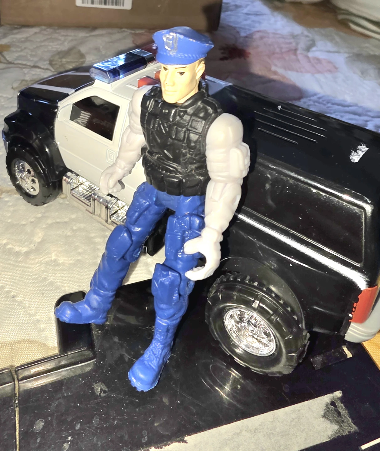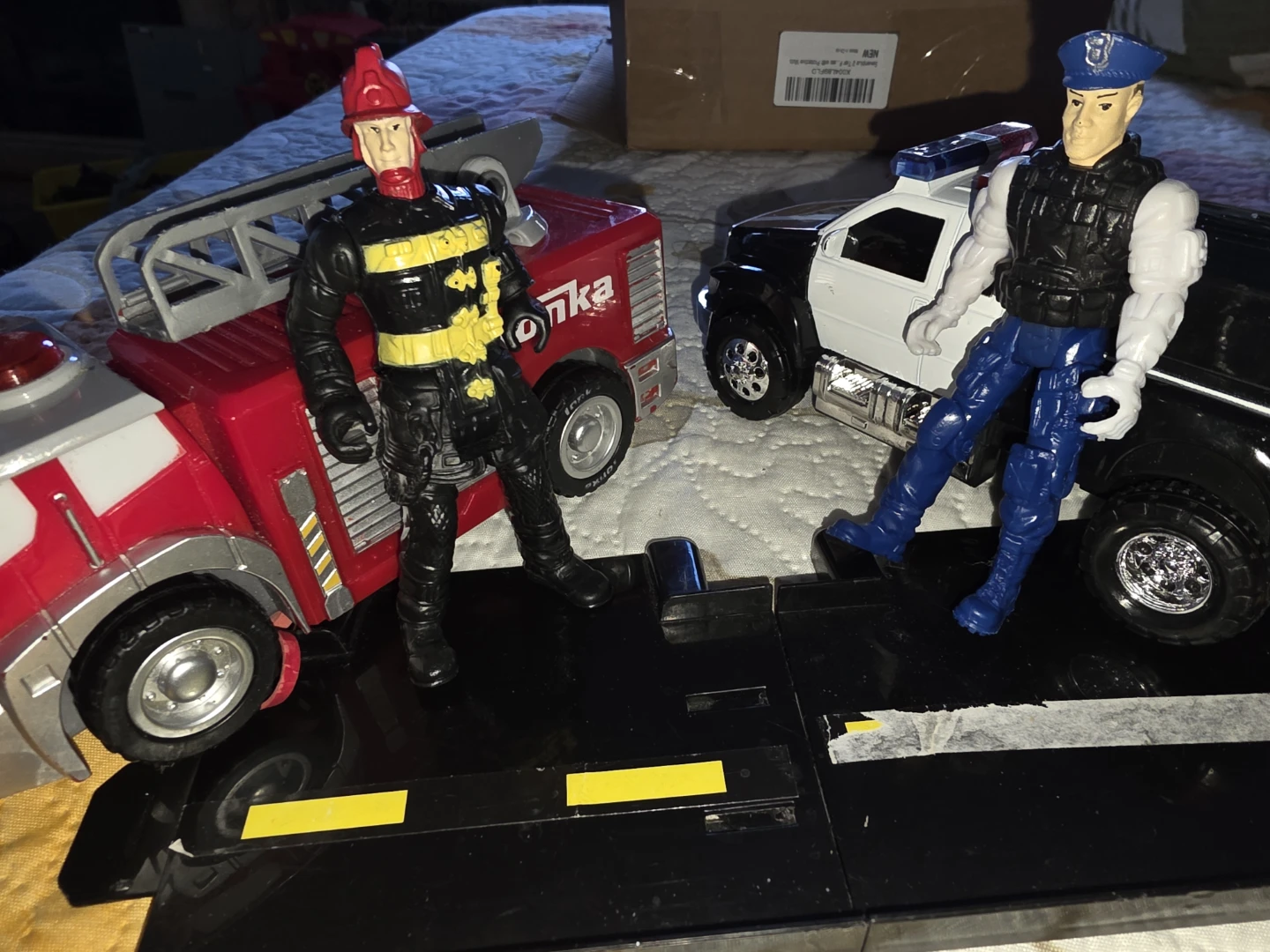 This set includes a Tonka fire truck and a police car, each with a posable action figure. The fire truck has a ladder. The police car has flashing lights. Great for imaginative play!