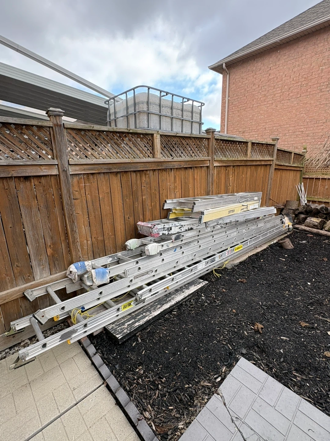 Bundle of three aluminum extension ladders. Various sizes suitable for different project heights. They're constructed from durable aluminum.