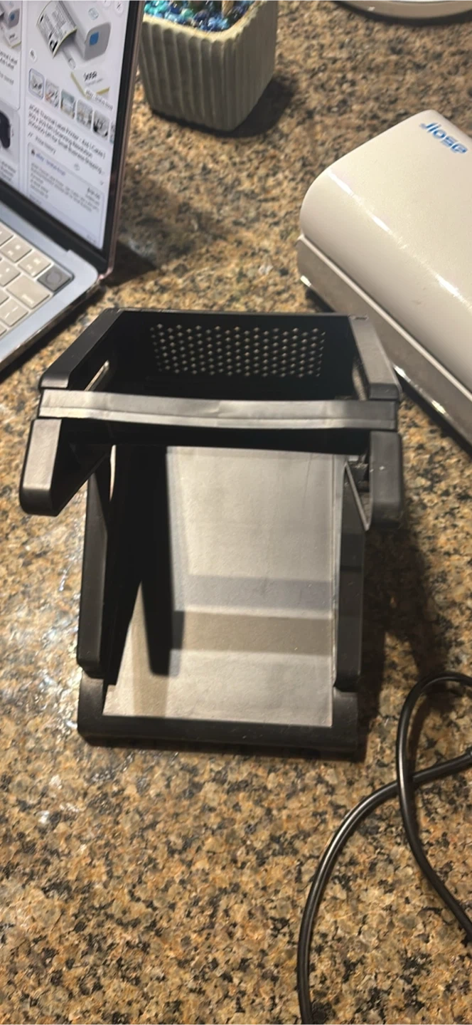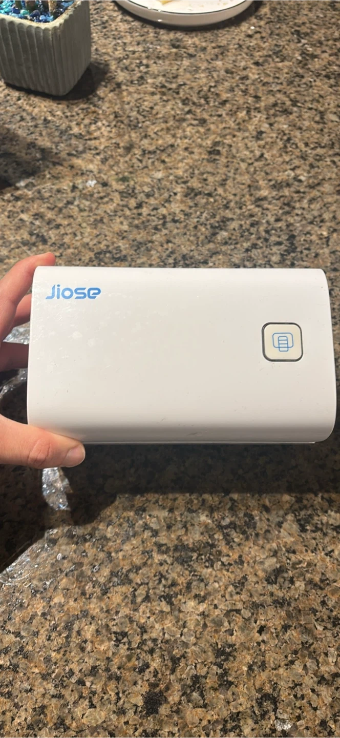 This is a white Jiose portable label maker. It includes the label maker unit, a power adapter, and a separate input tray. It's great for home organization needs!