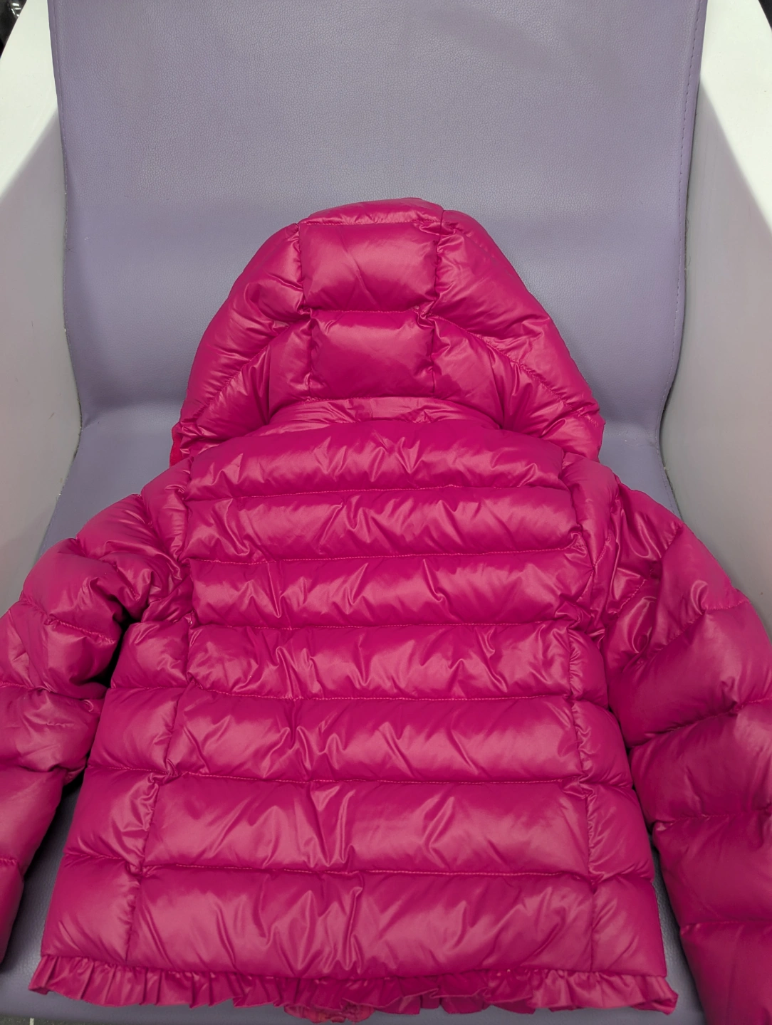 Adorable girls' pink puffer jacket. Size 4/4T. Features a hood and zipper closure. Excellent condition.