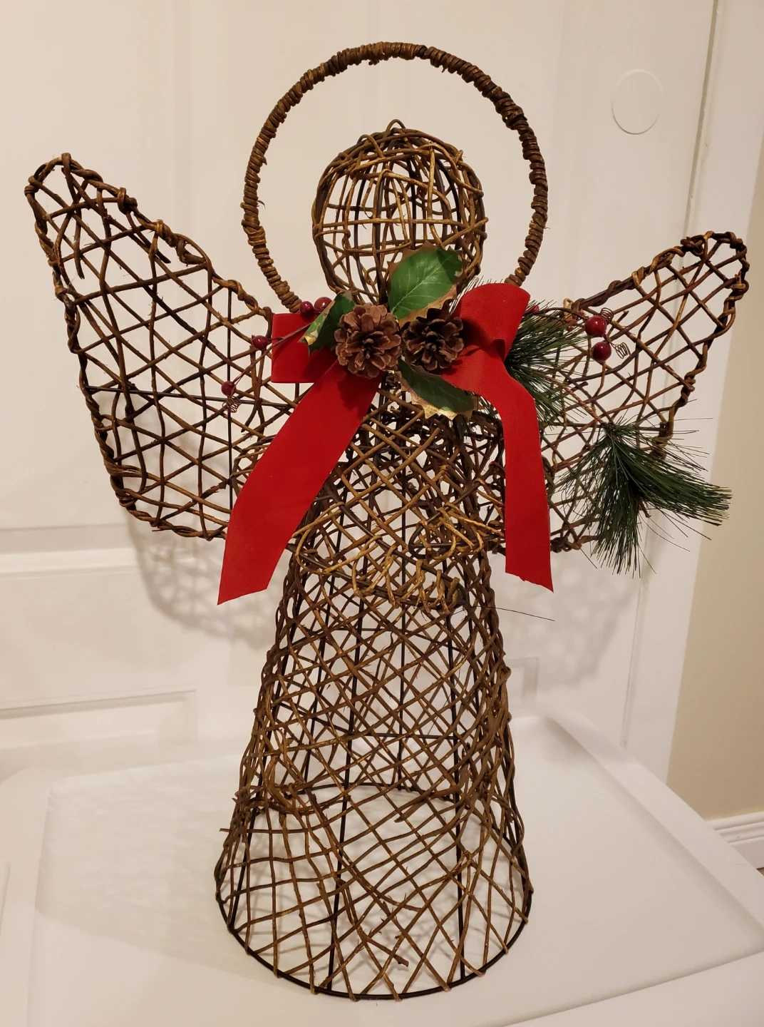 Made with steel wire and rattan intertwined with bow, cranberries, and pine cone trims. Approximately 23 1/4 inches tall.