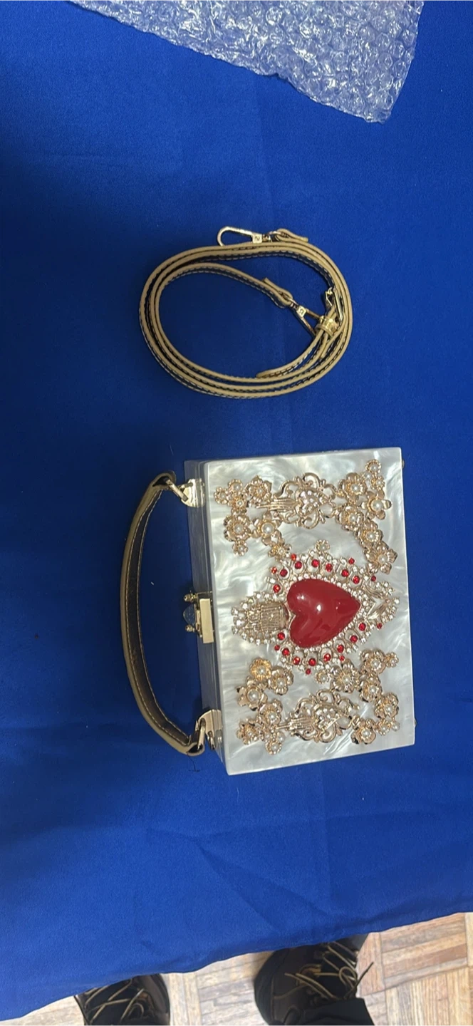 This decorative clutch features a white marbled exterior with intricate gold and red embellishments around a central red heart. It includes a top handle and a detachable gold chain strap for versatility. It's perfect for evening wear or special occasions!