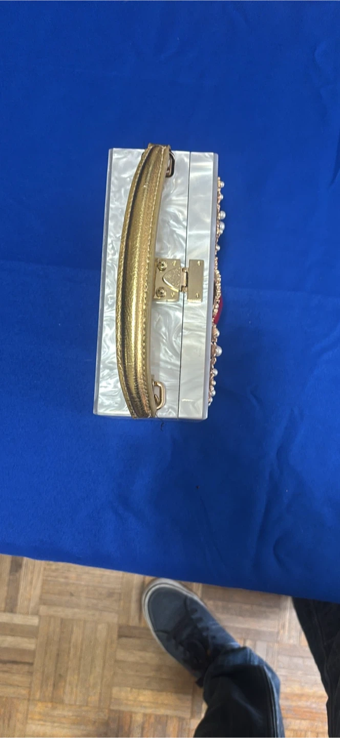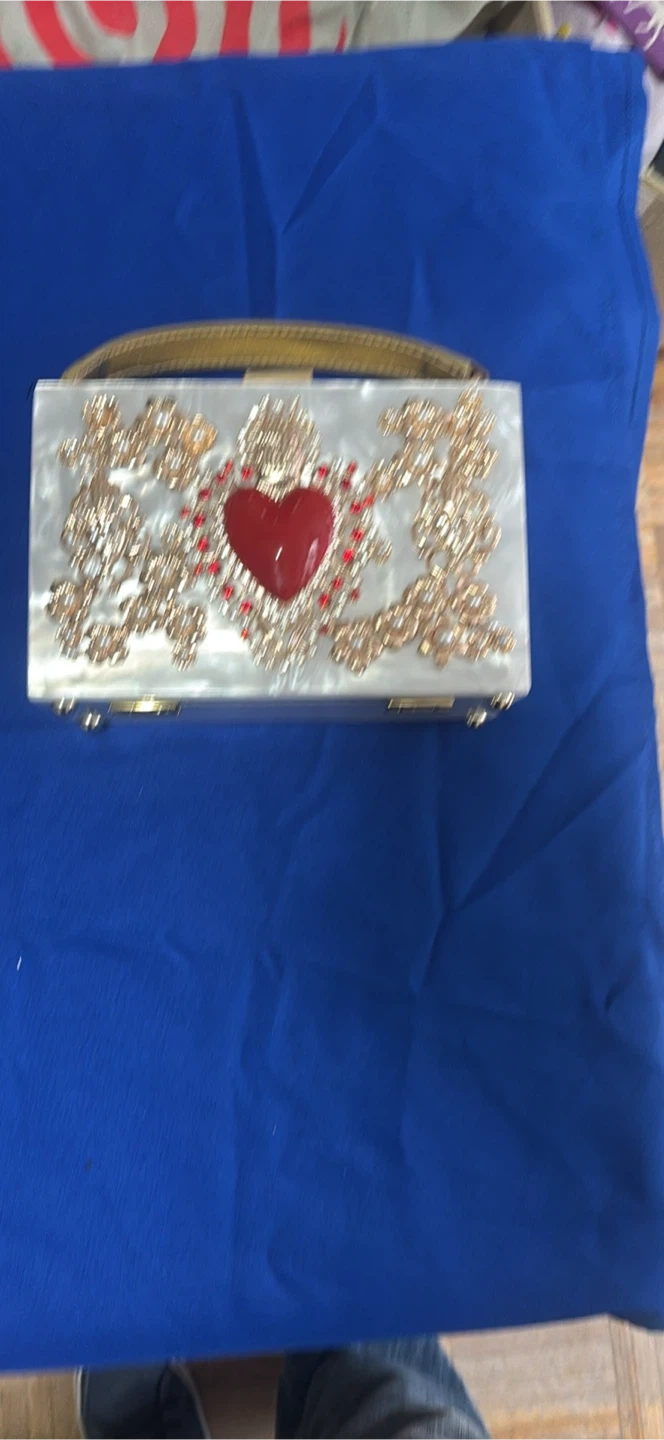 This decorative clutch features a white marbled exterior with intricate gold and red embellishments around a central red heart. It includes a top handle and a detachable gold chain strap for versatility. It's perfect for evening wear or special occasions!
