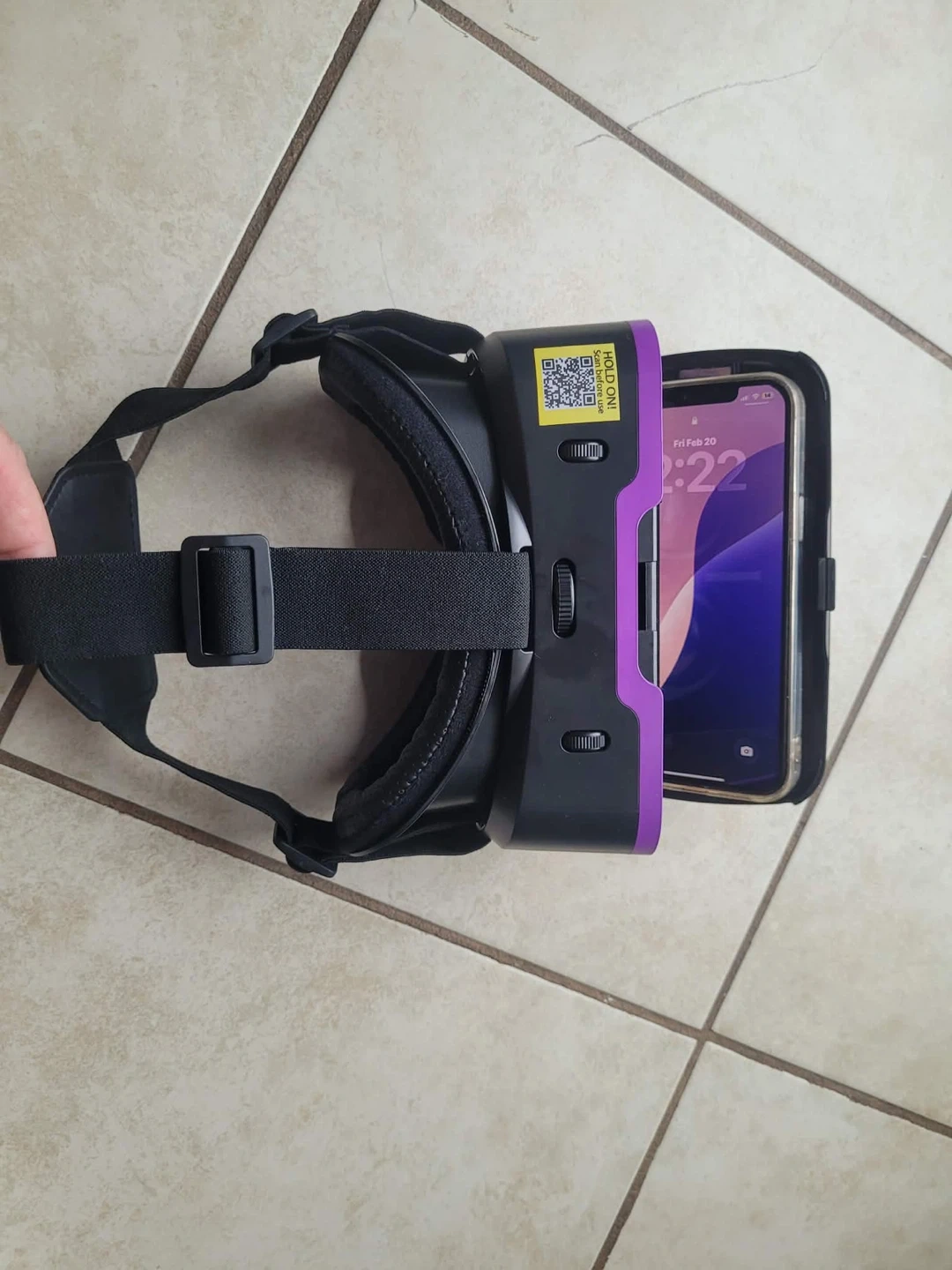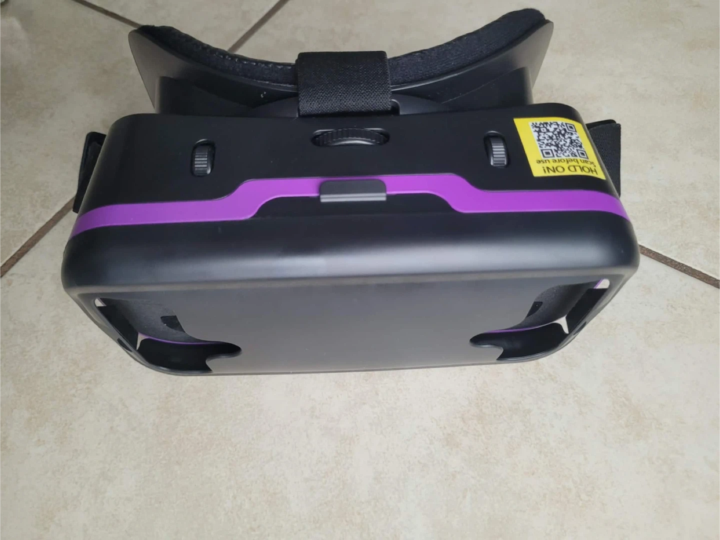 This black and purple VR headset features adjustable straps for a comfortable fit. It includes a slot for your smartphone, allowing for immersive experiences. Easy to use and set up!