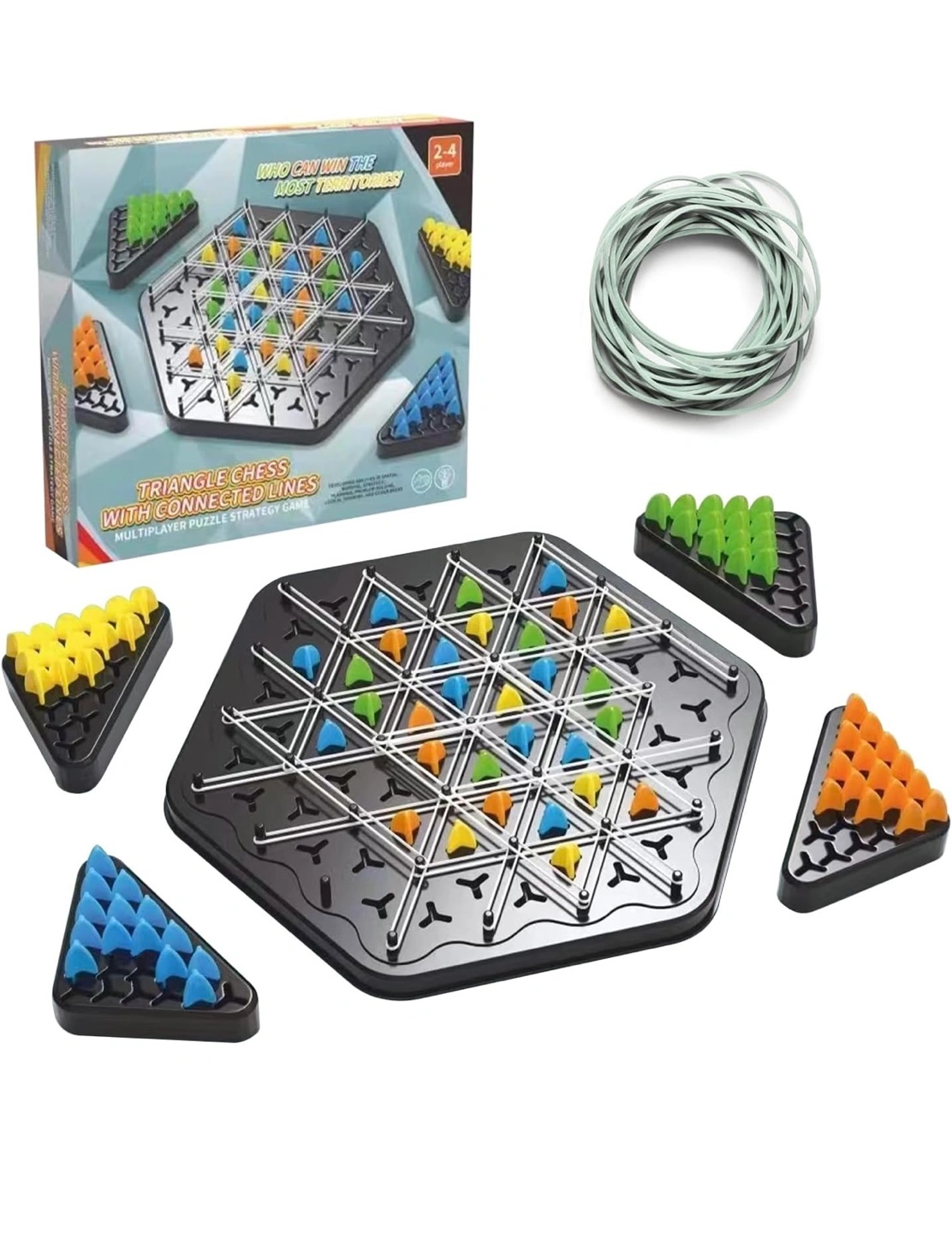 Two-player puzzle strategy game. Includes game board, four triangle pieces, and a rubber band.