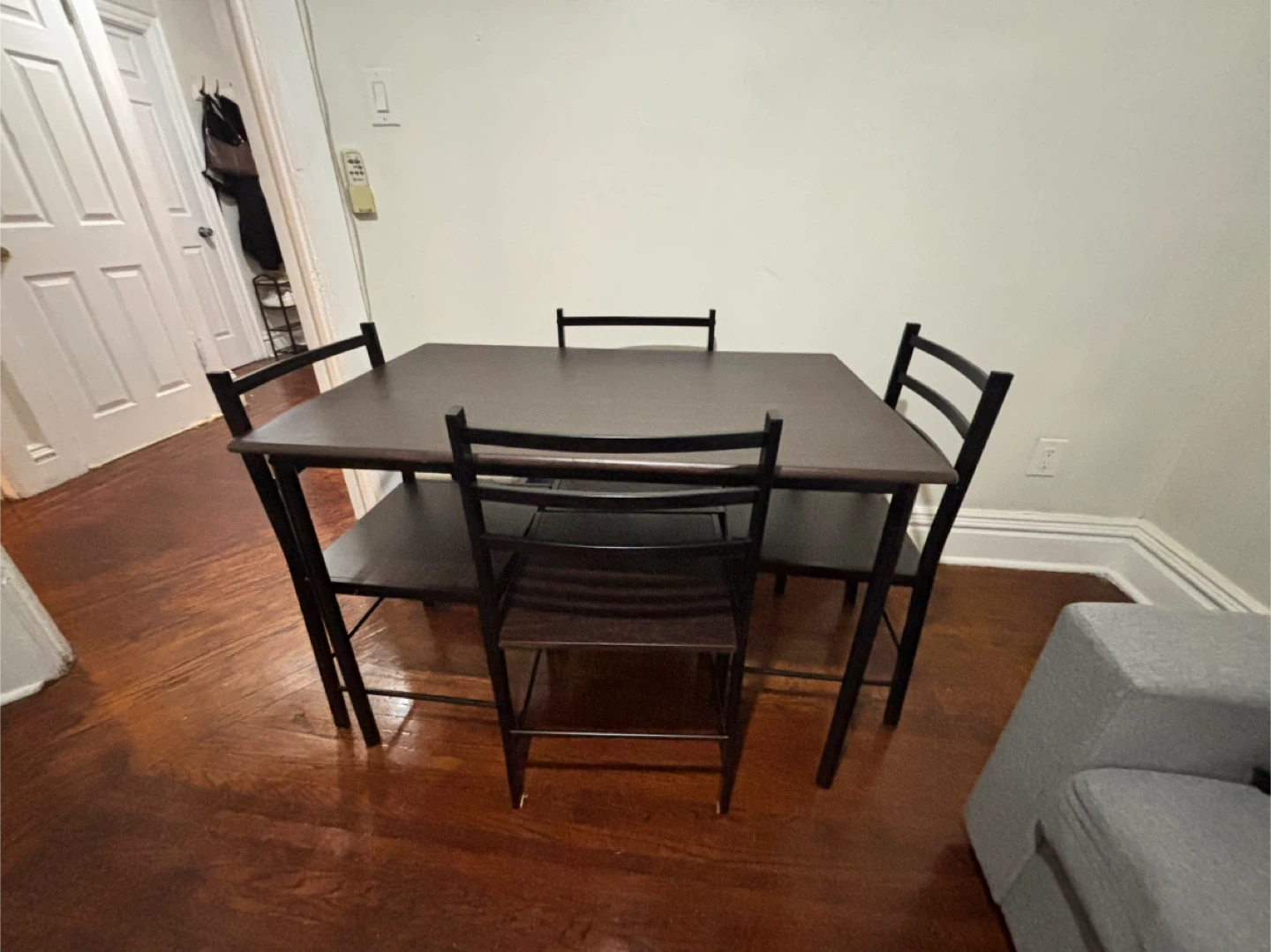 This compact dining set includes a table and four chairs, perfect for smaller spaces. The table and chair seats are a dark brown wood-look finish with black metal frames. It's a great setup for a breakfast nook or a cozy dining area.