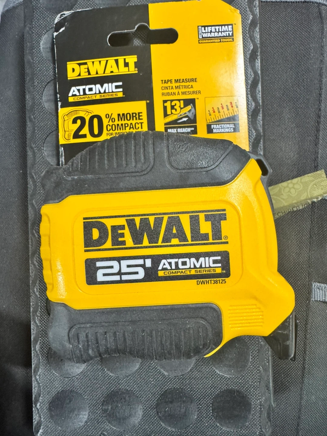 This is a DeWalt 25' Atomic Compact Series tape measure. It's 20% more compact and features fractional markings. It has a 13' max reach.