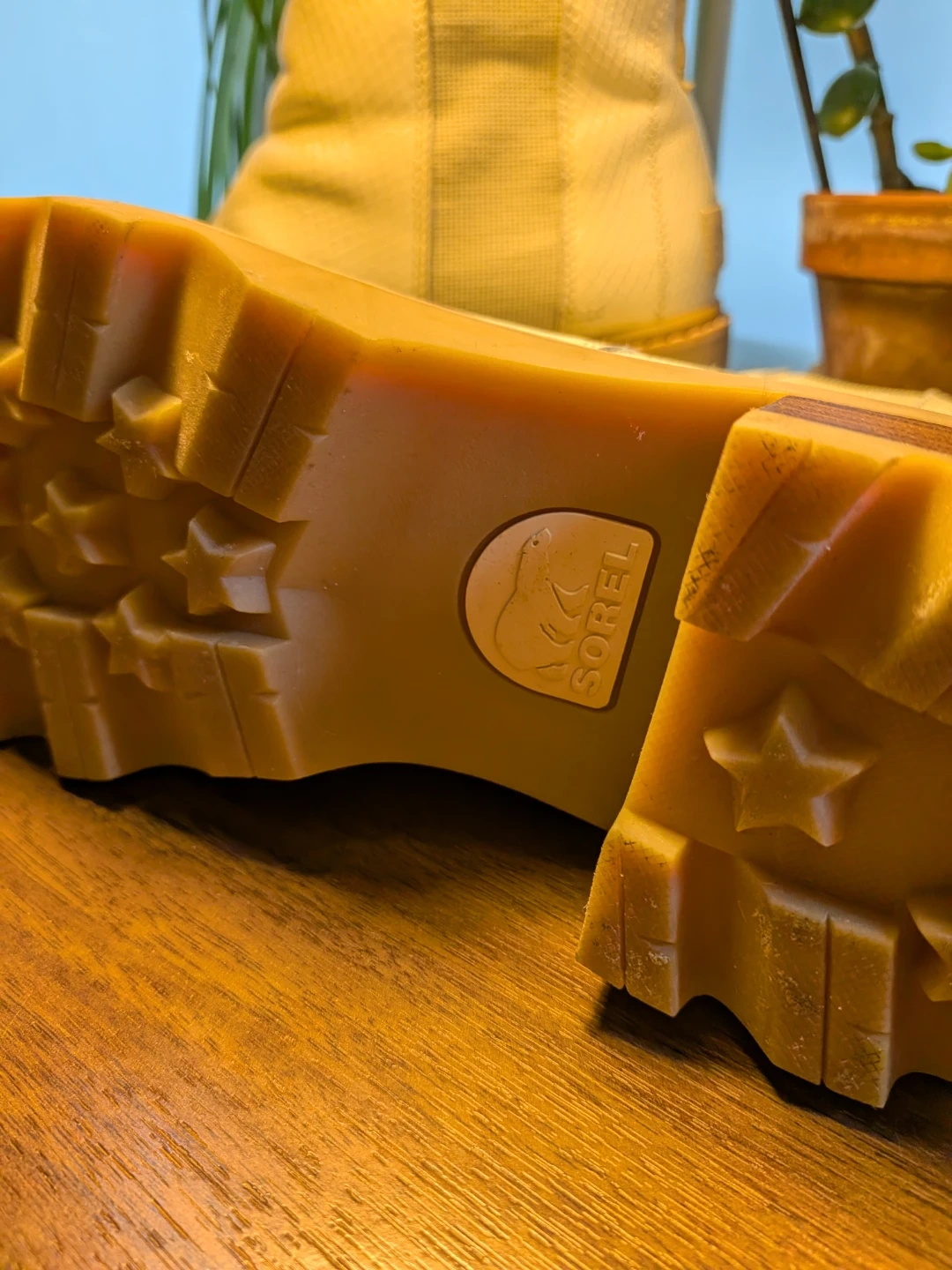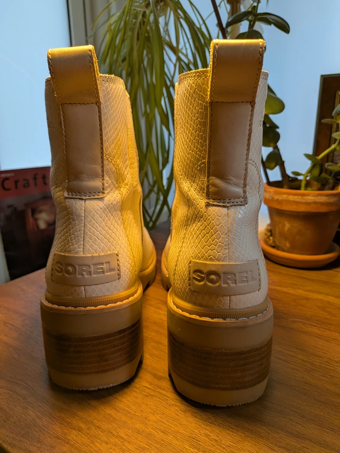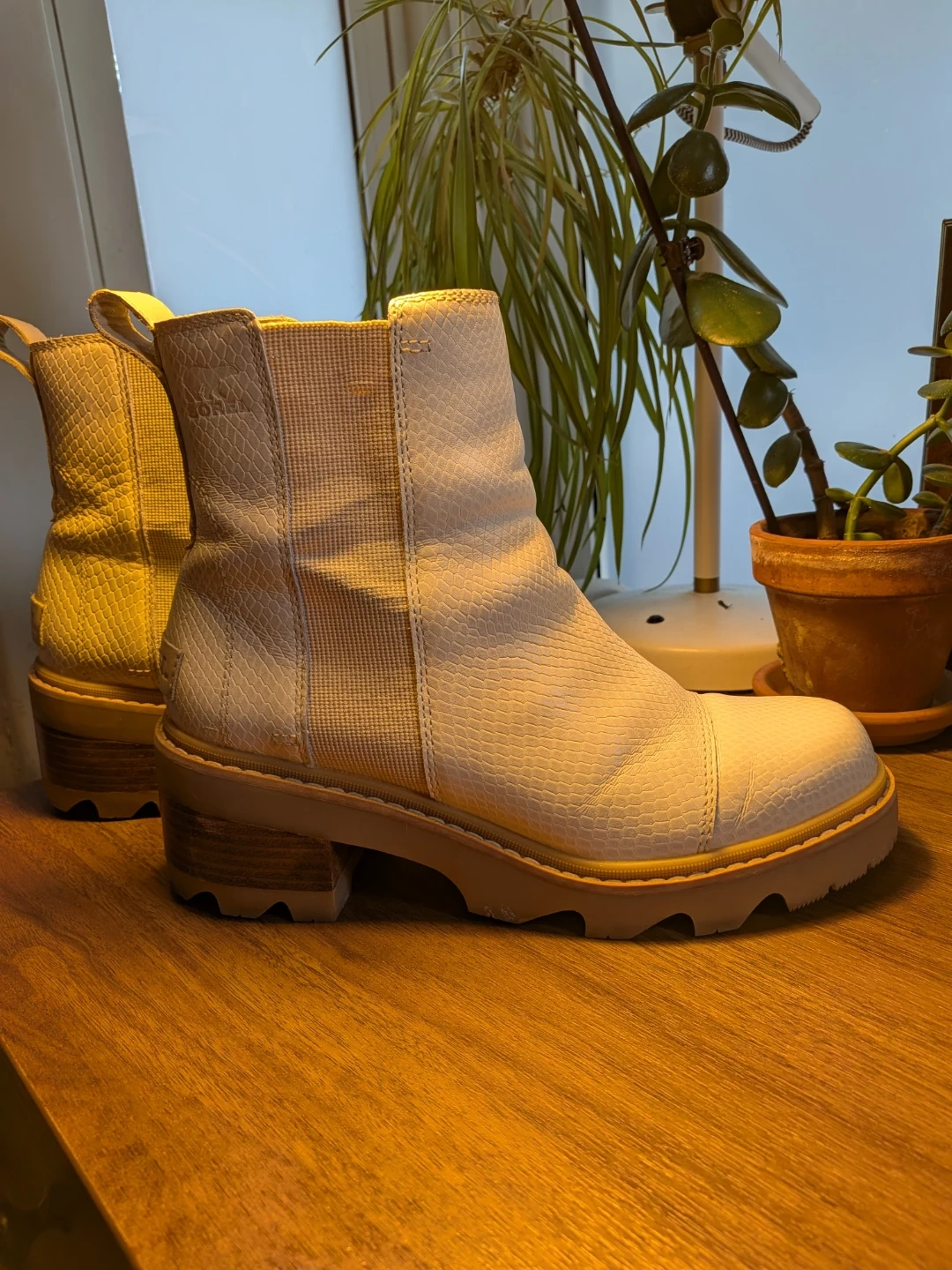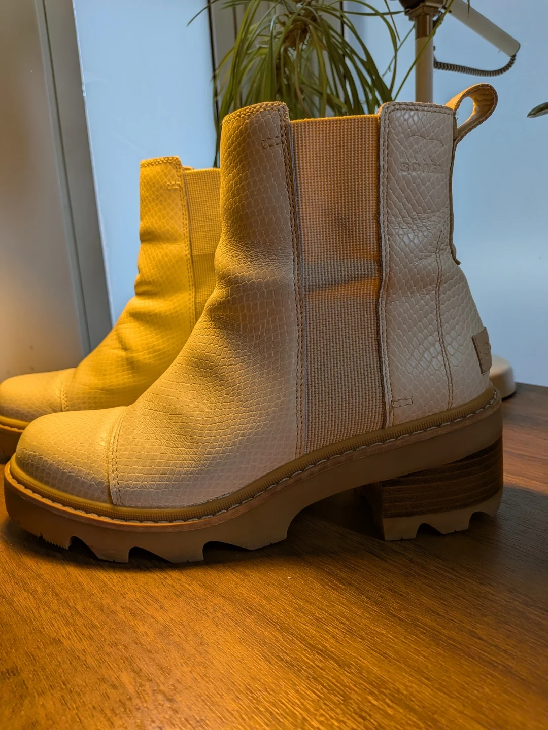 Cream coloured Sorel ankle boots with a snake-embossed pattern. These boots feature elastic side panels and a sturdy lug sole. They're comfortable for everyday wear.