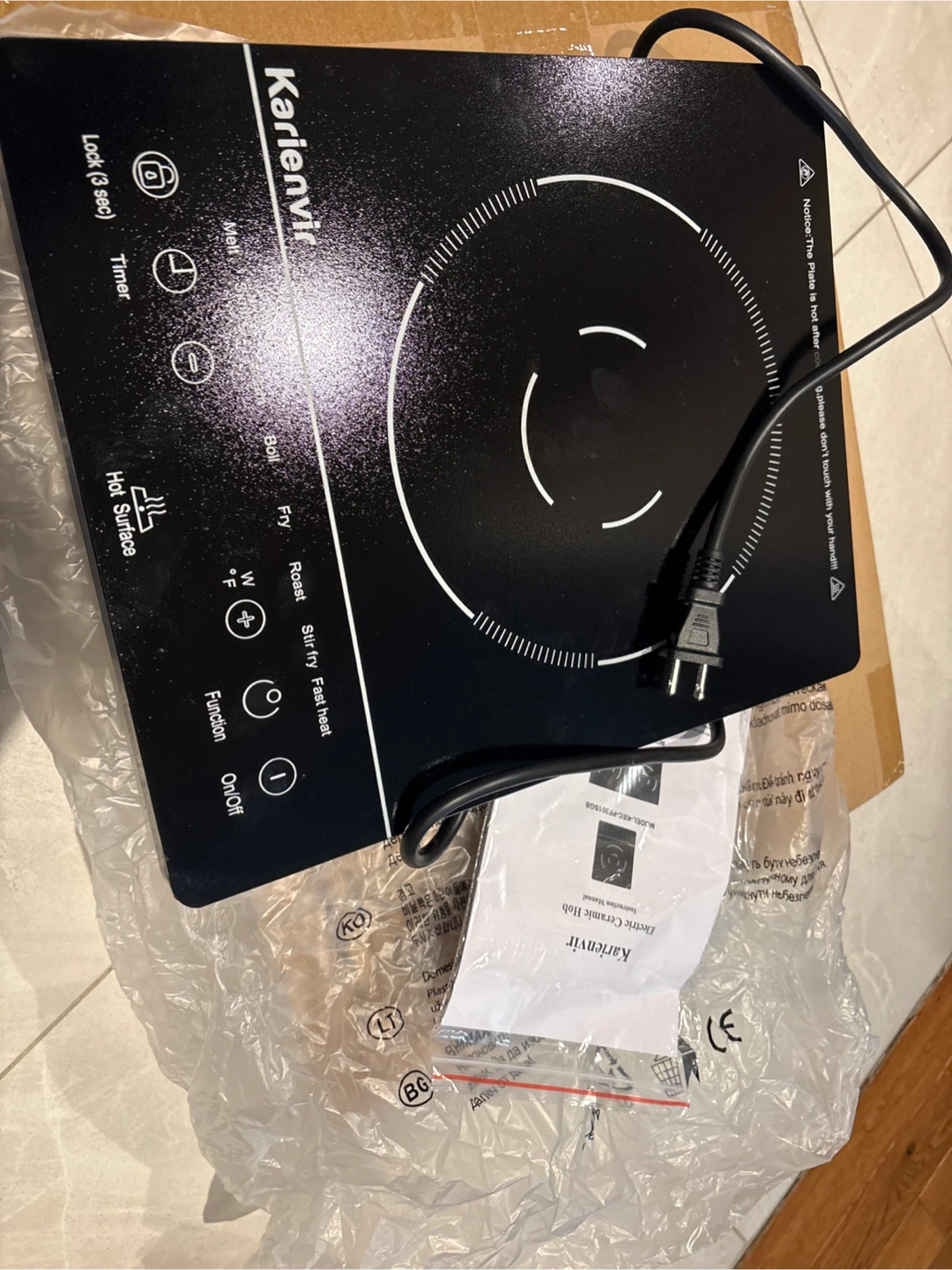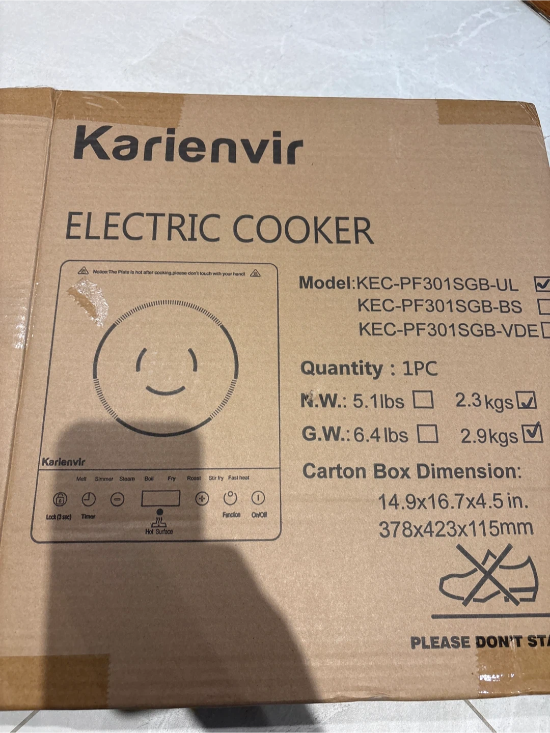 Selling a Karienvir electric cooker, model KEC-PF301SGB-UL. It's in great condition and comes with the original box. This cooker is lightweight at 2.3 kgs and has dimensions of 14.9x16.7x4.5 inches. It's great for stir-frying and fast heating