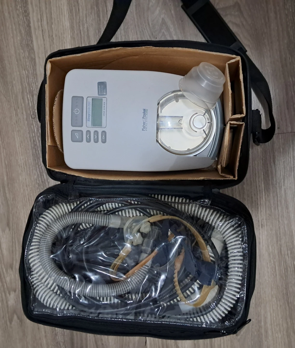 This is a Fisher & Paykel SleepStyle 200 CPAP Series machine. It includes the main unit and a travel bag with various hoses and accessories. It's ready for use!