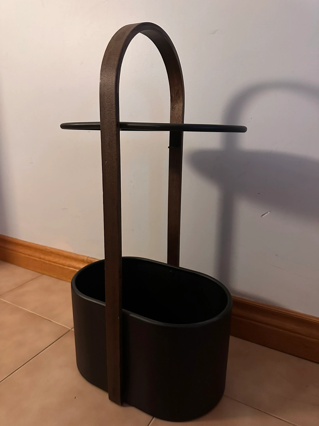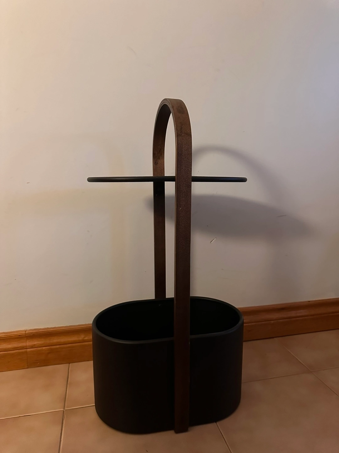 Stylish storage table. Features a black oval storage bin and a small circular top shelf. Dark brown wooden frame with arched handle. Perfect for magazines, remotes, or other small items. Got gifted to me but never used it.
