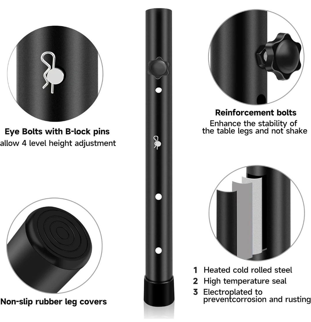 These table leg extenders are designed to raise your folding table to standing height. They feature eye bolts with B-lock pins for four levels of height adjustment and non-slip rubber leg covers. Made from heated cold-rolled steel, electroplated to prevent corrosion and rusting. They enhance stability and reduce shaking.