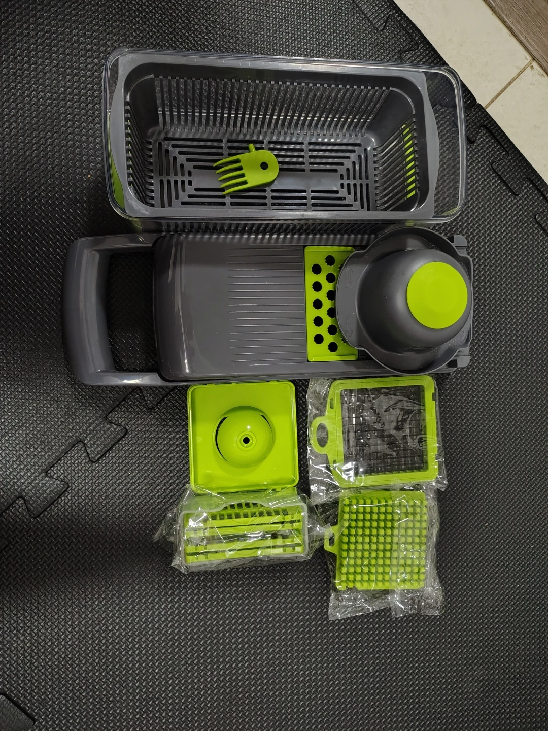 Looking to make meal prep easier? This vegetable chopper is perfect for quickly dicing and slicing veggies! It comes with multiple interchangeable blades and a container to catch everything. The colours are grey and green. It's new, never used it before
