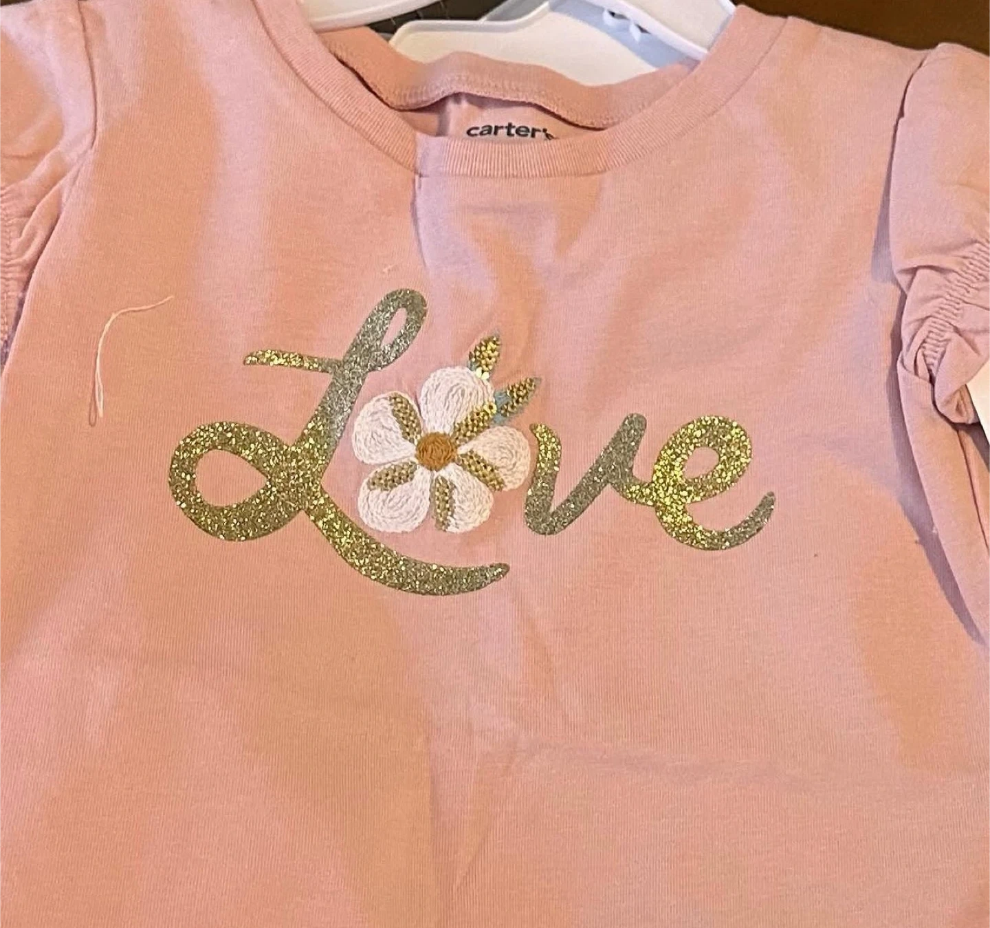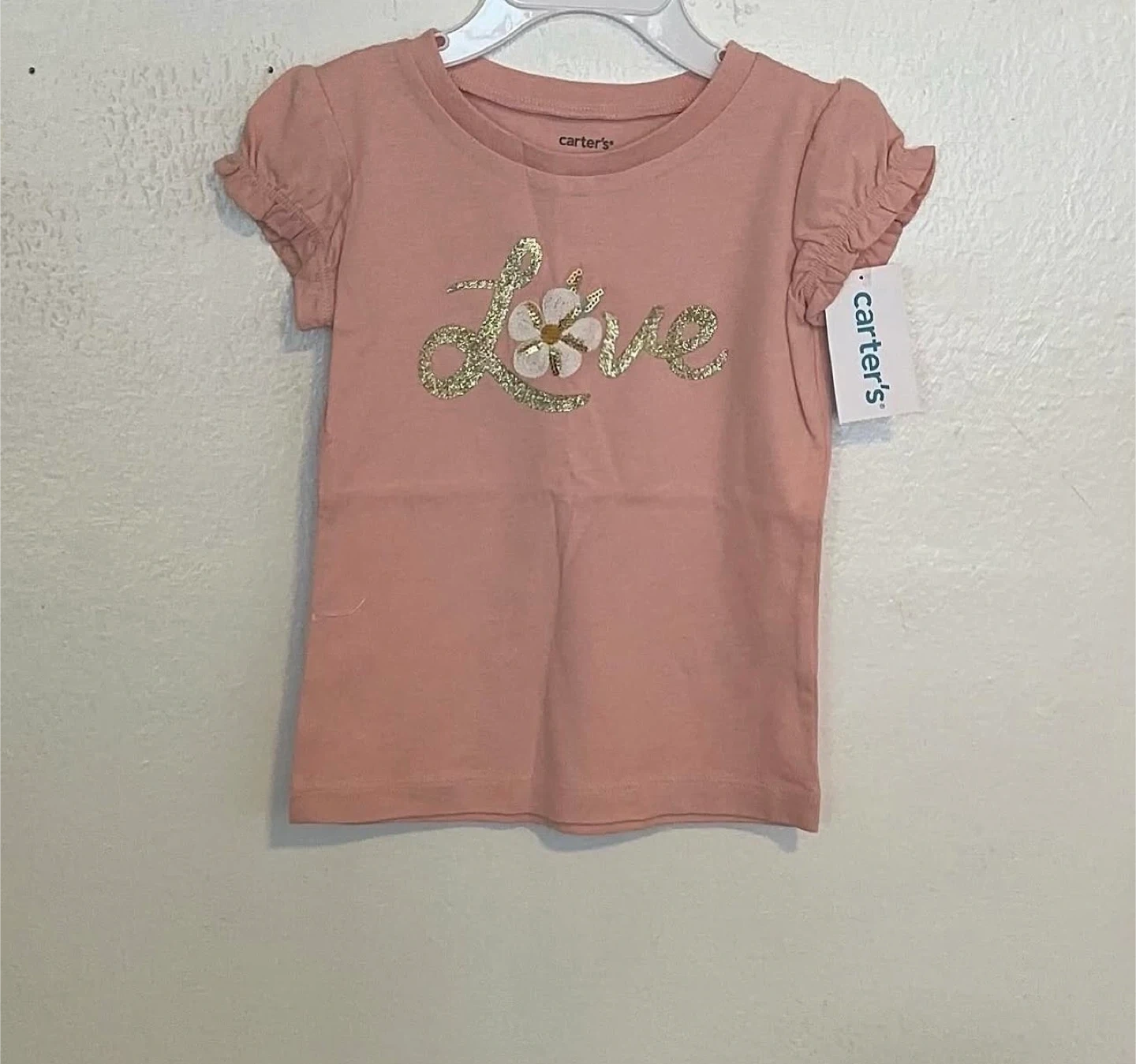 Carter's short-sleeve t-shirt in a soft pink colour. It features a "Love" graphic with gold glitter and a small embroidered flower. Ruffled cap sleeves add a cute detail.