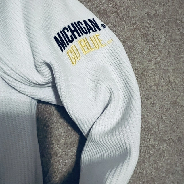 Show your team spirit with this Colosseum Athletics Michigan Go Blue white jacket, size large. This jacket is in good condition, perfect for showing off your Michigan pride, whether you're heading to the game or just out and about! It features the iconic 'M' logo and 'Michigan Go Blue' on the sleeve. Here are some of its features: * Full zip front * Embroidered logos * Ribbed texture * Front pockets. Let me know if you're interested!